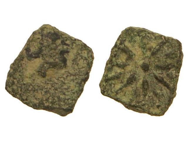 Uncia. MALACA. Anv.: Cabeza con mitra y coleta a derecha. Rev.: Estrella de dieciséis rayos. 1,40 grs. Variante por forma de la cabeza. Pátina verde. Cospel cuadrado. (Oxidaciones). AB-No cat.; G.G.-110. MBC-.