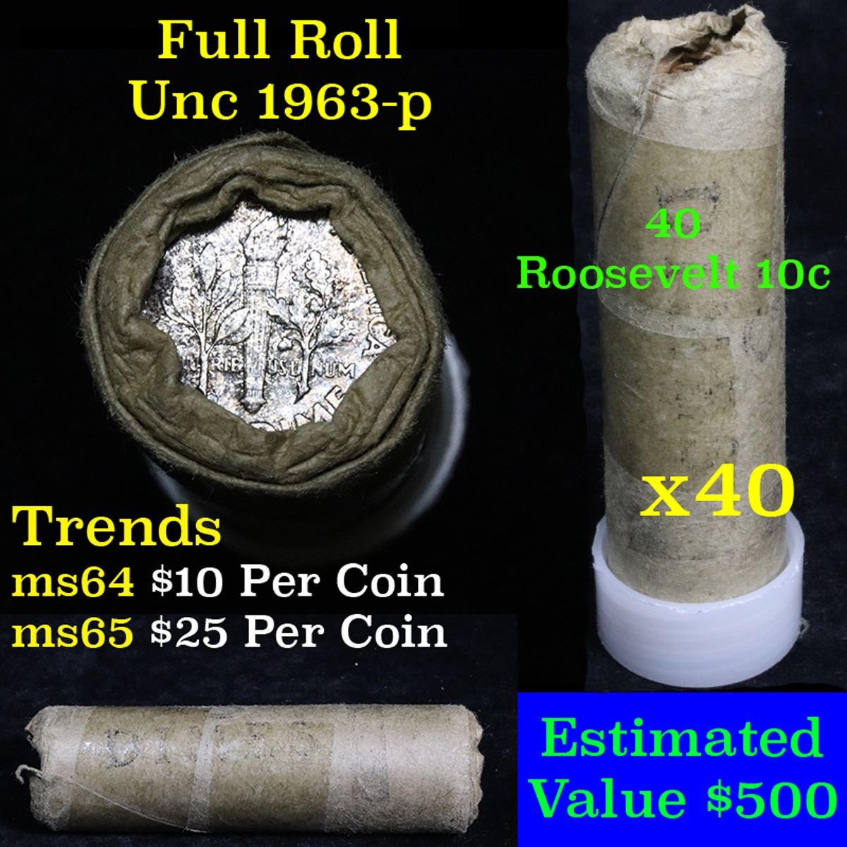 Uncirculated 1963-p Roosevent Dime 10c orig shotgun roll. A real find. A great roll of brilliant uncirculated Roosevelt dimes. All 1963-p. Trends lists ms64 at $10/each, $500