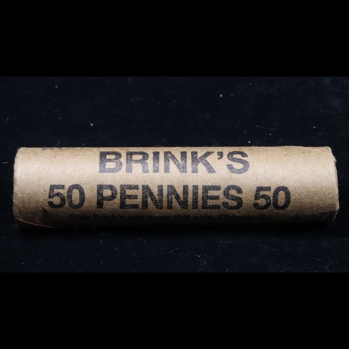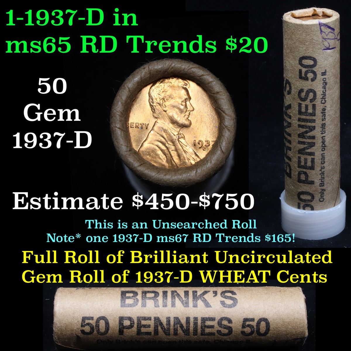 Uncirculated 1c orig shotgun roll, 1937-d in old Brink's wrapper. A terrific orig shotgun roll of Lincoln cents. The ends are Gem cherry red. This is in an Old Brinks wrapper, "Only Brinks can open this safe, Chicago, IL". Trends ms65 rd $20 and ms64rd $12. Estimate $600