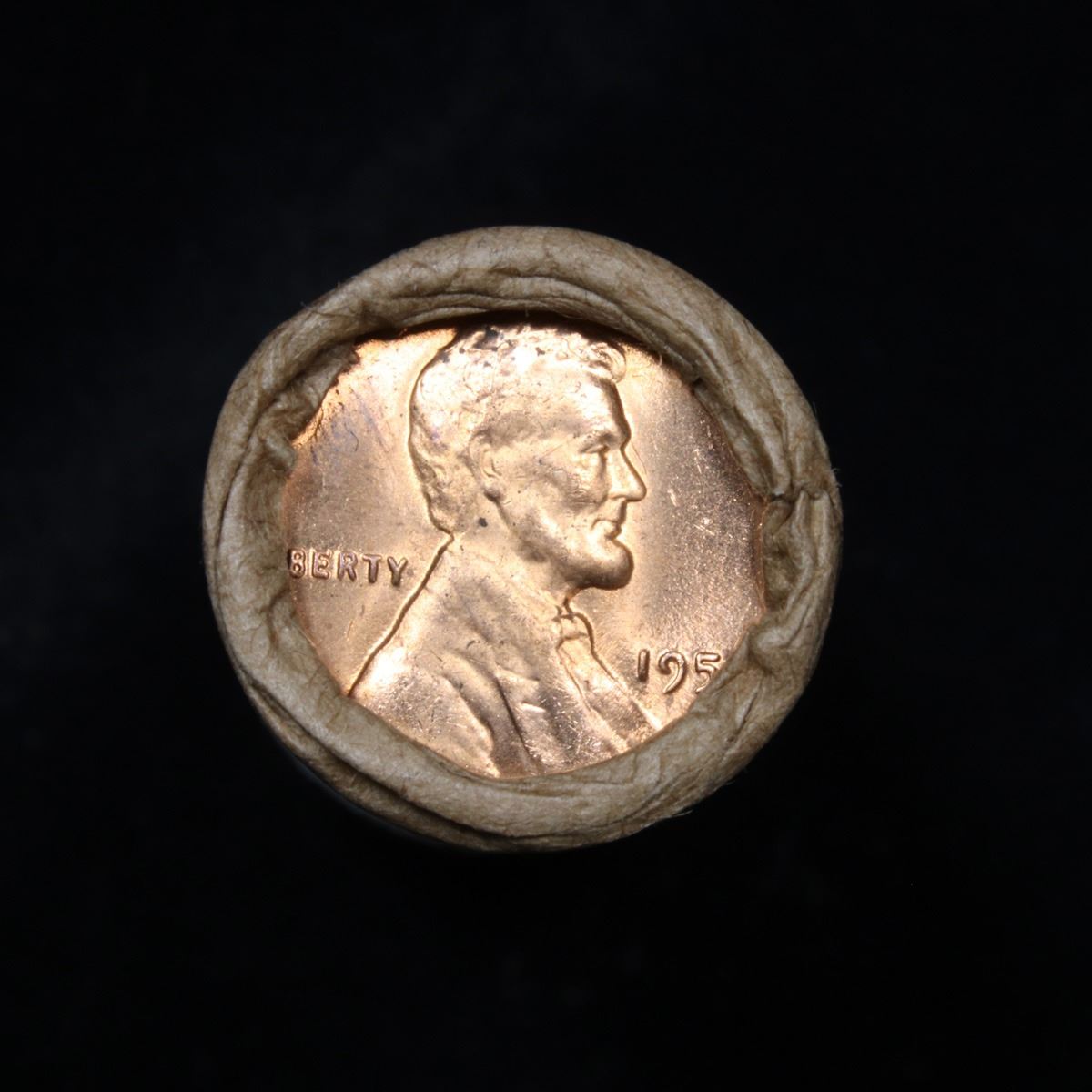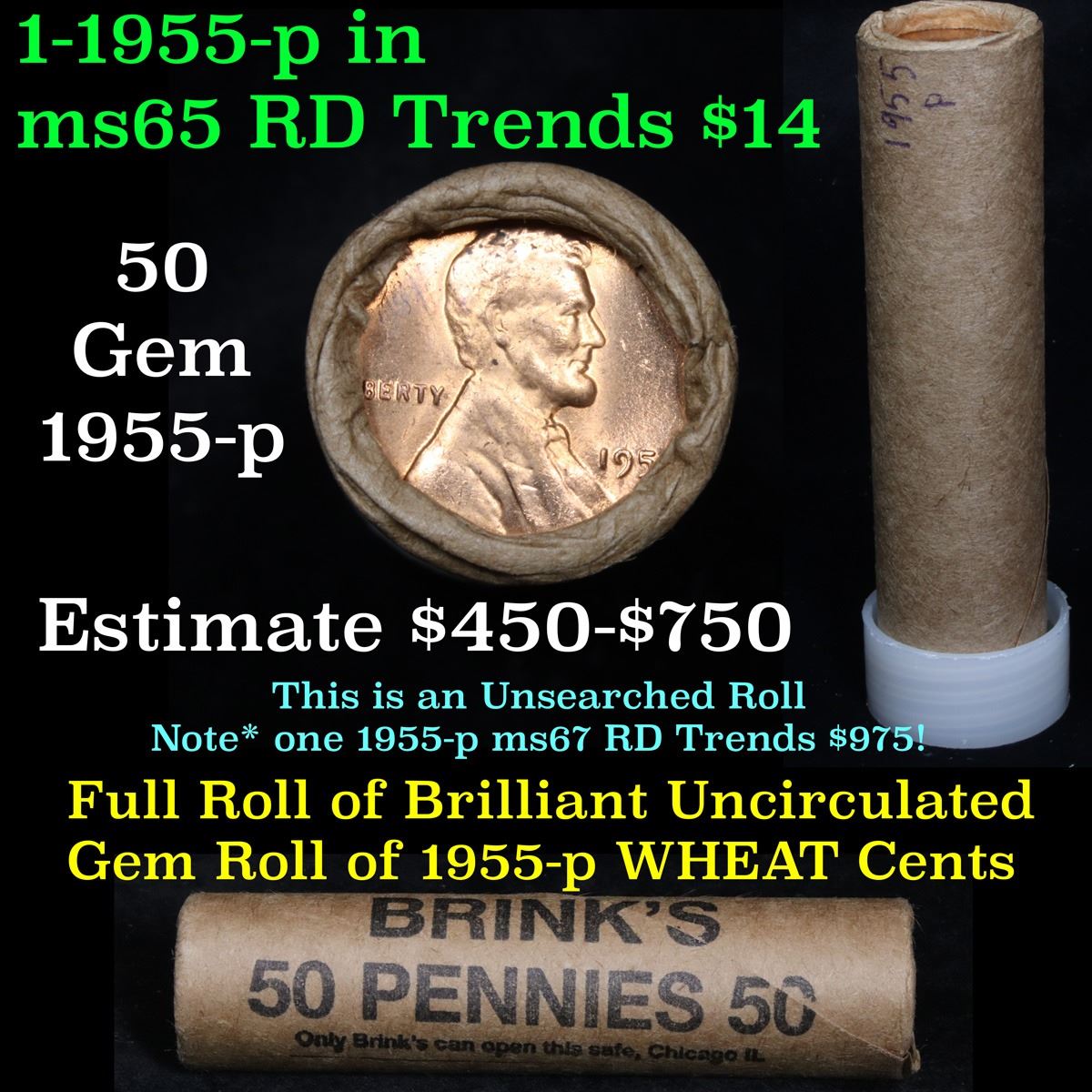 Uncirculated 1c orig shotgun roll, 1955-p In Old Brinks wrapper . A terrific orig shotgun roll of Lincoln cents. All coins cherry red. This is in an Old Brinks wrapper, "Only Brinks can open this safe, Chicago, IL". Trends ms65 rd $14. Estimate $700