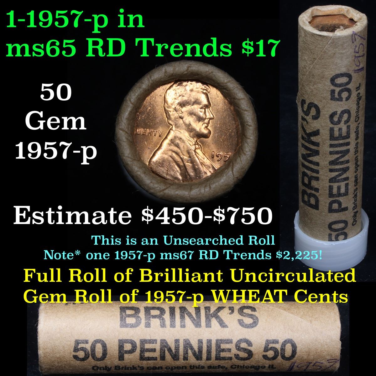 Uncirculated 1c orig shotgun roll, 1957-p in old Brink's wrapper. A terrific orig shotgun roll of Lincoln cents. The ends are Gem cherry red. This is in an Old Brinks wrapper, "Only Brinks can open this safe, Chicago, IL". Trends ms65 rd $17. Estimate $400