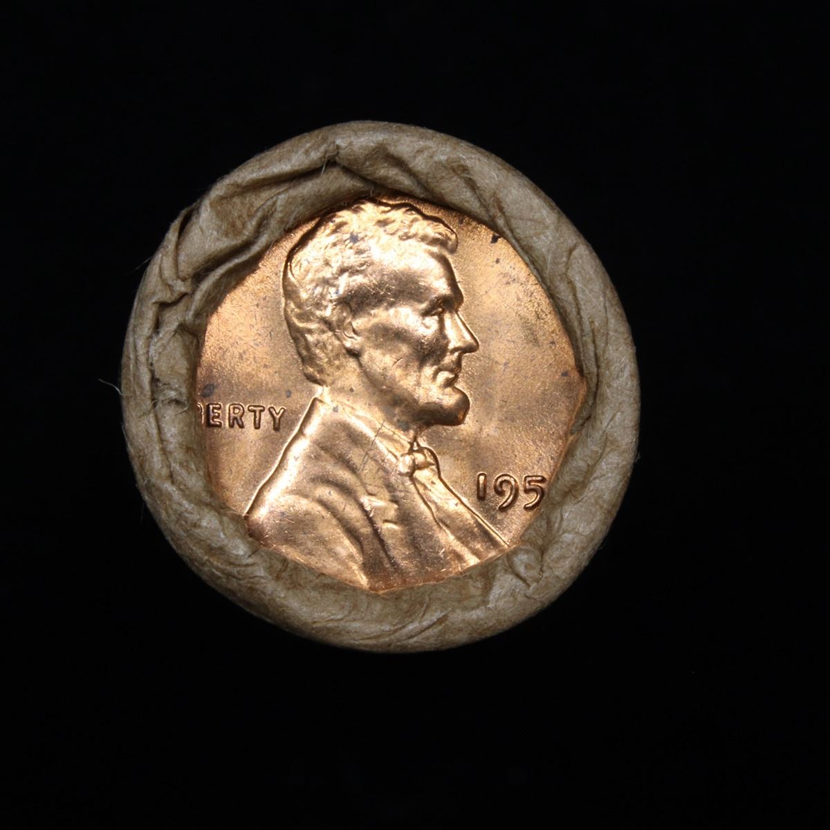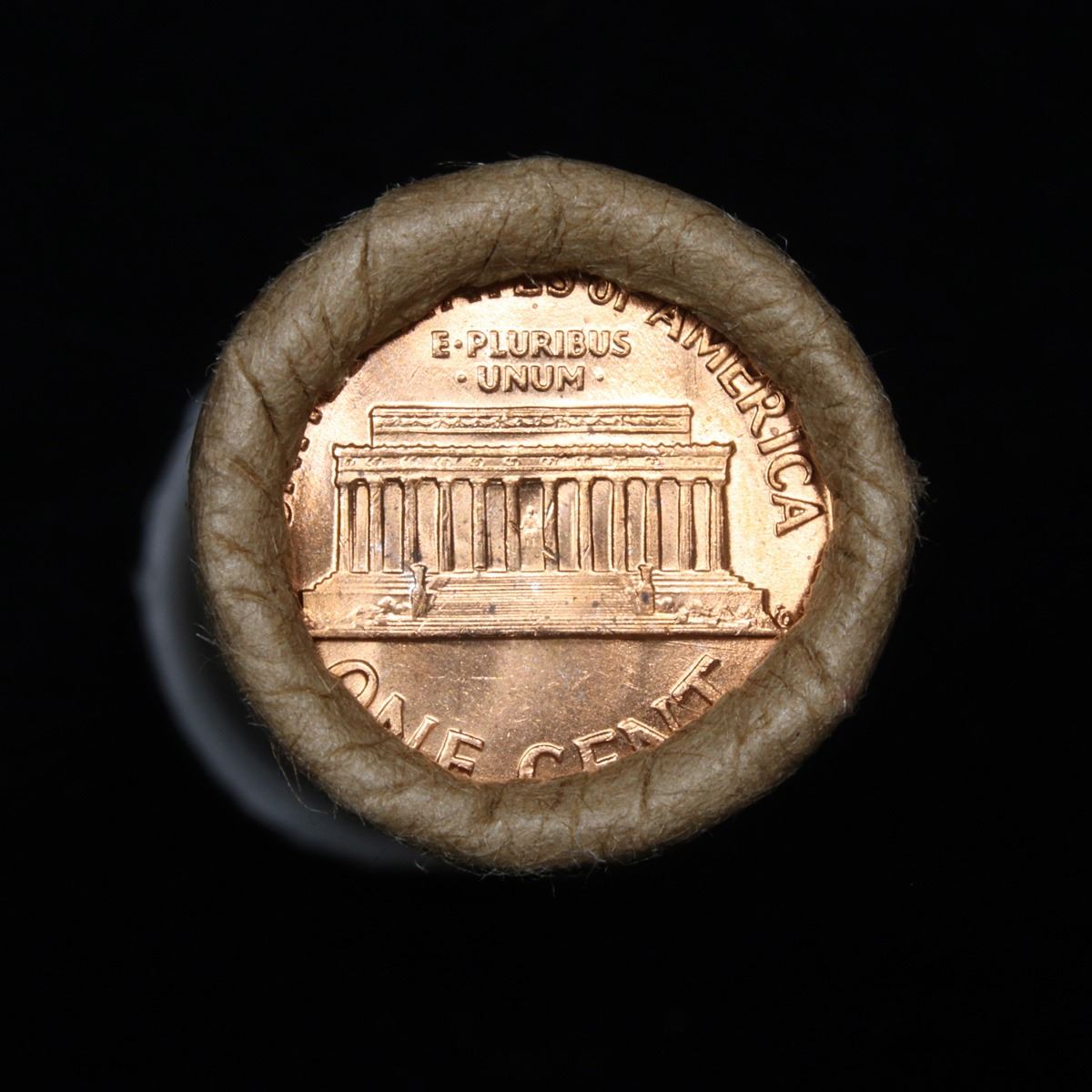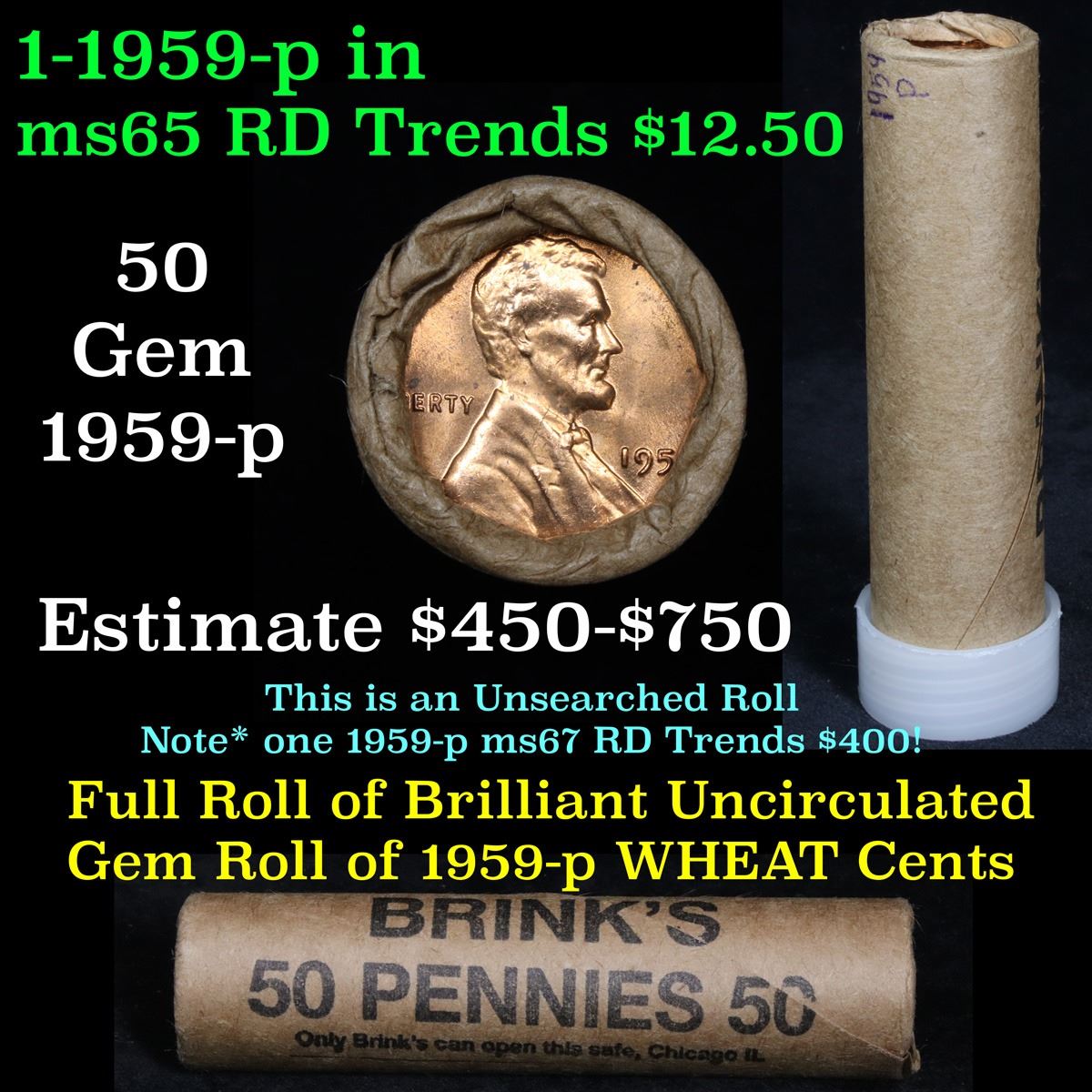 Uncirculated 1c orig shotgun roll, 1959-p In Old Brinks wrapper . A terrific orig shotgun roll of Lincoln cents. All coins cherry red. This is in an Old Brinks wrapper, "Only Brinks can open this safe, Chicago, IL". Trends ms65 rd $12.50, ms64rd $7.50. One coin in ms67rd is $400. Estimate $625