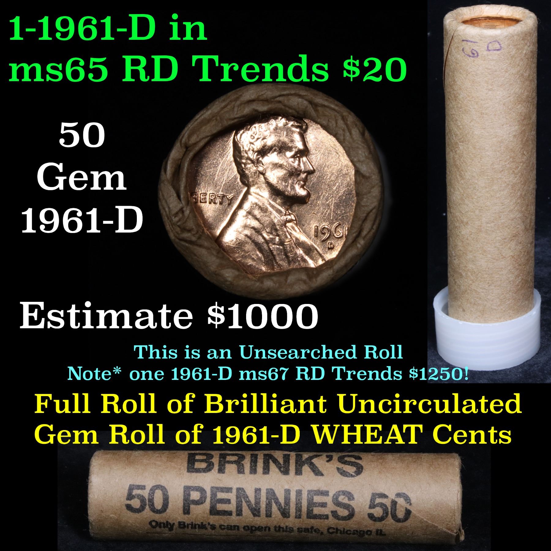 Uncirculated 1c orig shotgun roll, 1961-d In Old Brinks wrapper . A terrific orig shotgun roll of Lincoln cents. All coins cherry red. This is in an Old Brinks wrapper, "Only Brinks can open this safe, Chicago, IL". Trends ms65rd $20, ms64rd $10. One coin is ms67rd is $1250. Estimate $1000