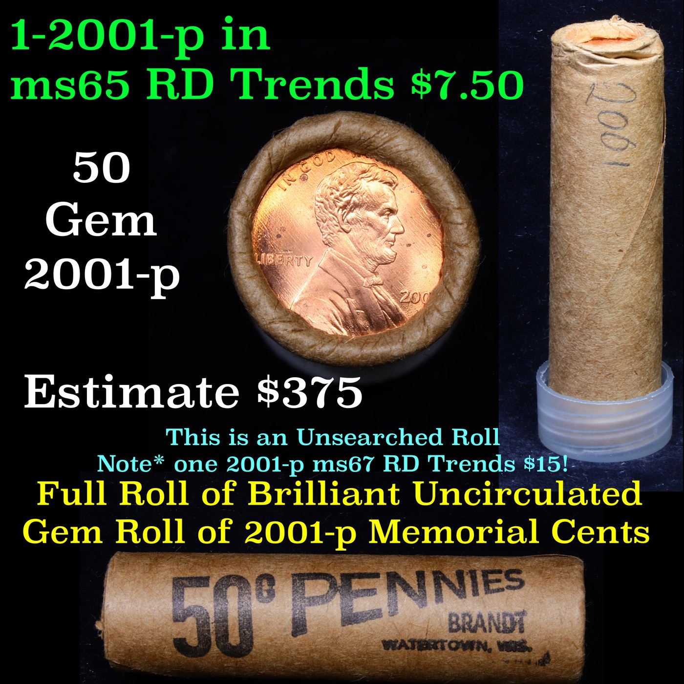 Uncirculated 1c orig shotgun roll, 2001-p In Old Brandt wrapper . ÊA terrific orig shotgun roll of Lincoln cents. All coins cherry red. ÊTrends ms65 rd $7.50 Estimate $375