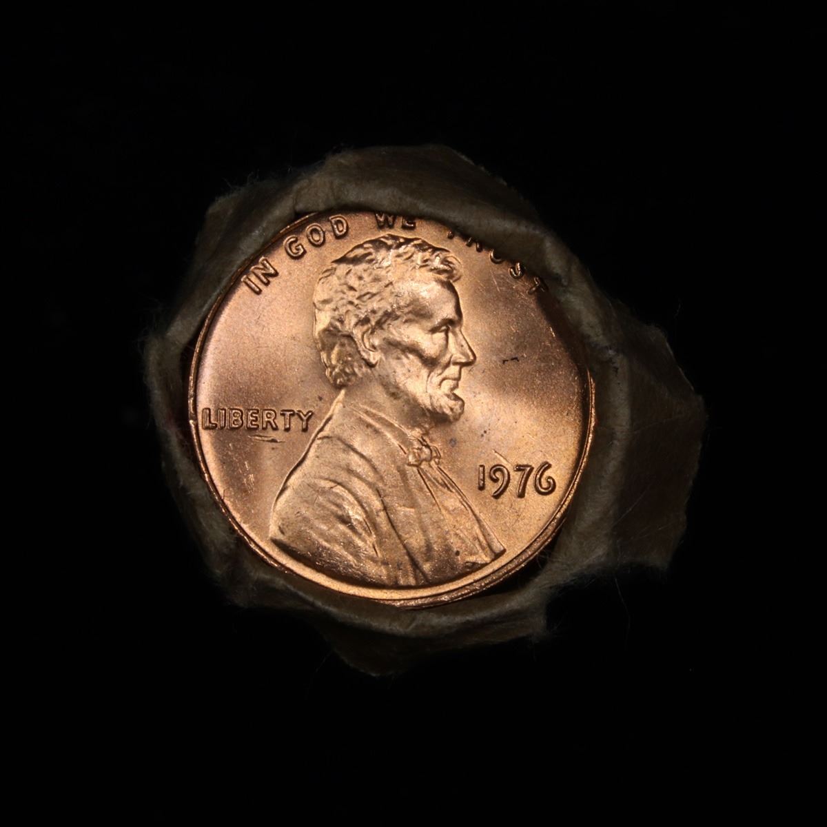 Uncirculated 1c roll in penny wrapper, 1976-p, ends are open . ÊAn uncirculated roll of Lincoln cents. From the ends they appear all cherry red. ÊThe roll appears to be untouched. It looks like the ends were opened but the coins were not removed or even looked at. It seems to be a Gem red roll. Trends ms65 rd $12.50 and ms64rd $7.50. Estimate $625.