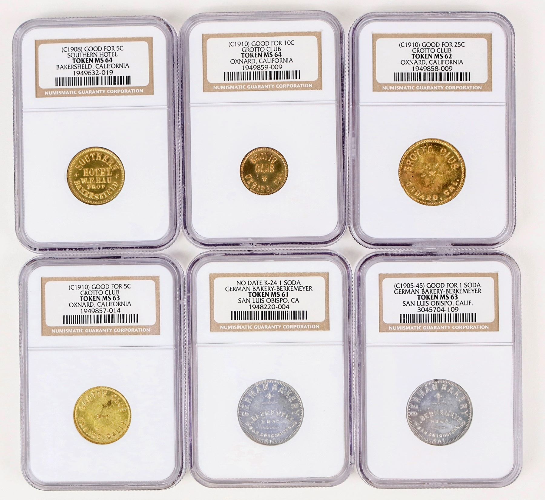 Six uncirculated tokens graded by NGC: Grotto Club, Oxnard (3):MS 62,63,64; Southern Hotel, Bakersfield MS 64; German Bakery, San Luis Obispo (2) MS 61, 63.