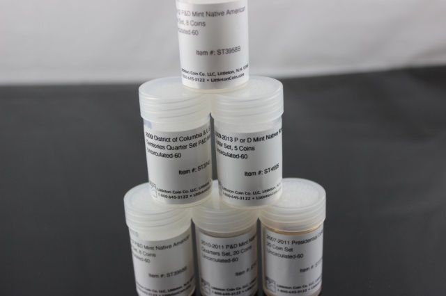 This wonderful lot includes 20 Quarters from 2010 and 2011 of the national parks. (3)2009 -2012 Native American Dollar Set of 8 coins. 2009 - 2013 Native American Dollar set of 5 coins. 2007 - 2011 Presidential Dollar set of 20 coins. 2009 District of Columbia & US Territories Quarters of 12 coins. These coins were produced in Denver and Philadelphia and are is amazing uncirculated condition. These coins are in protective packaging from Littleton Coin Co. District of Columbia & US Territories Quarters of 12 coins. These coins were produced in Denver and Philadelphia and are is amazing uncirculated condition. These coins are in protective packaging from Littleton Coin Co.