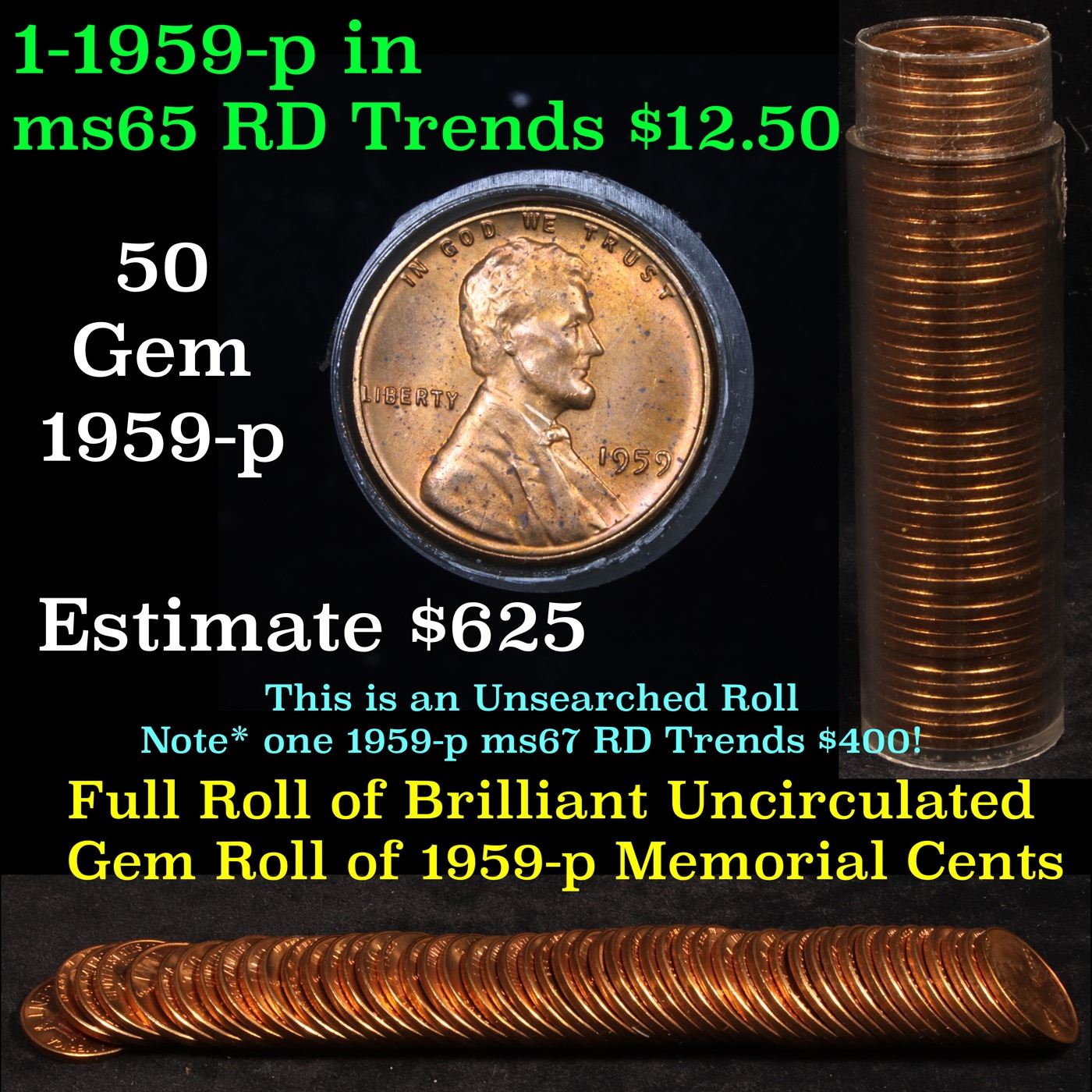 Uncirculated Lincoln 1c roll, 1959-p 50 pcs Grades. A terrific roll of Lincoln cents. All coins cherry red. Trends ms65 rd $12.50 Estimate $625