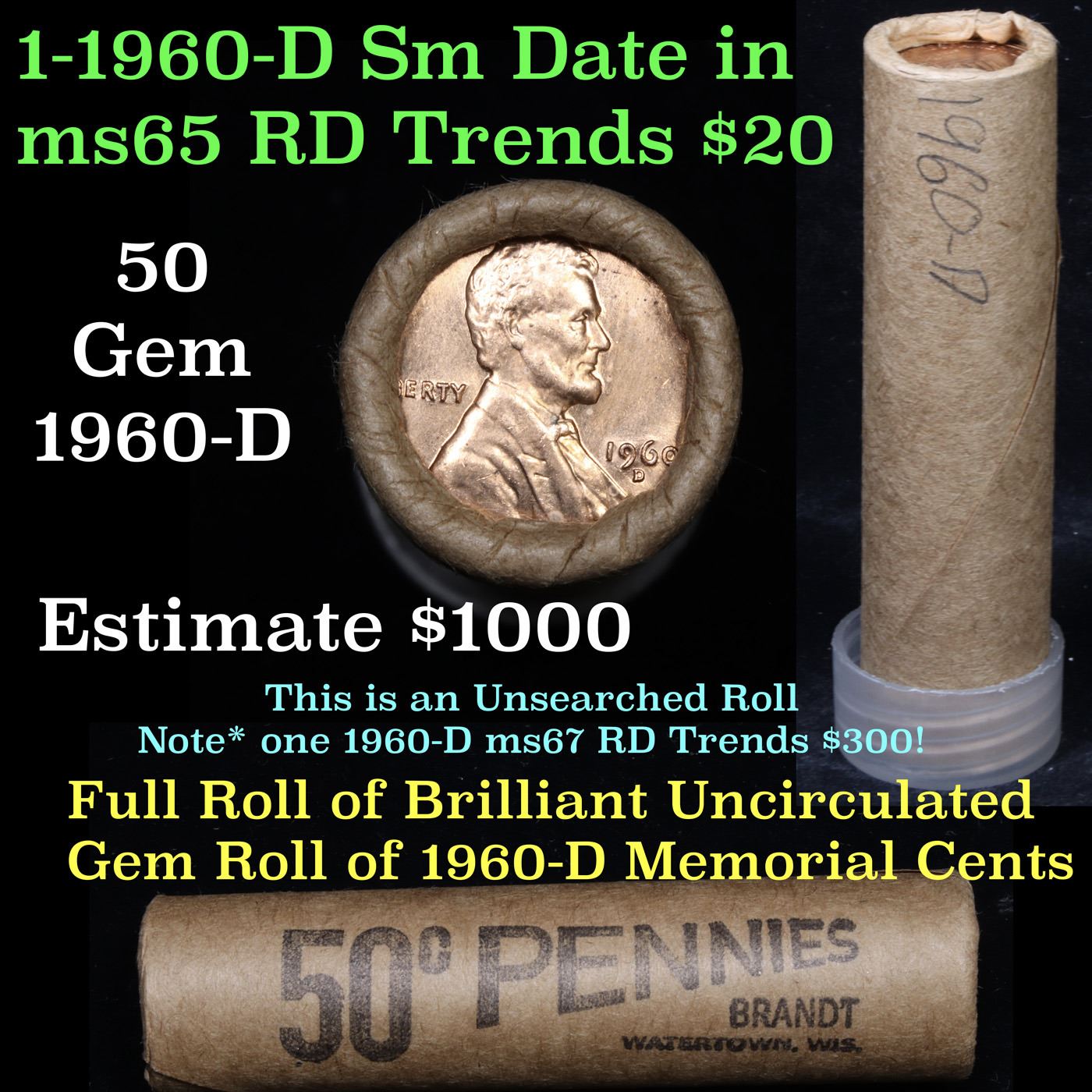 Uncirculated Shotgun Lincoln 1c roll, 1960-d small date 50 pcs Brinks Wrapper Grades