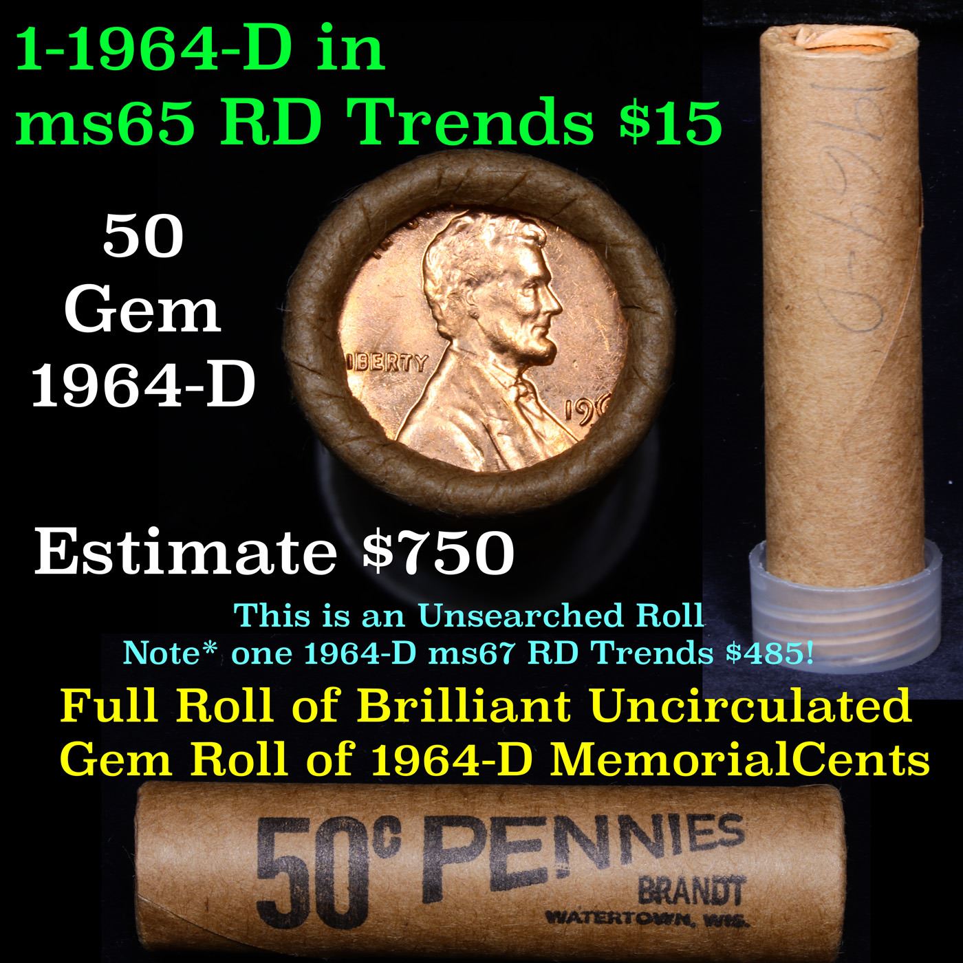 Uncirculated Shotgun Lincoln 1c roll, 1964-d 50 pcs Brandt Wrapper