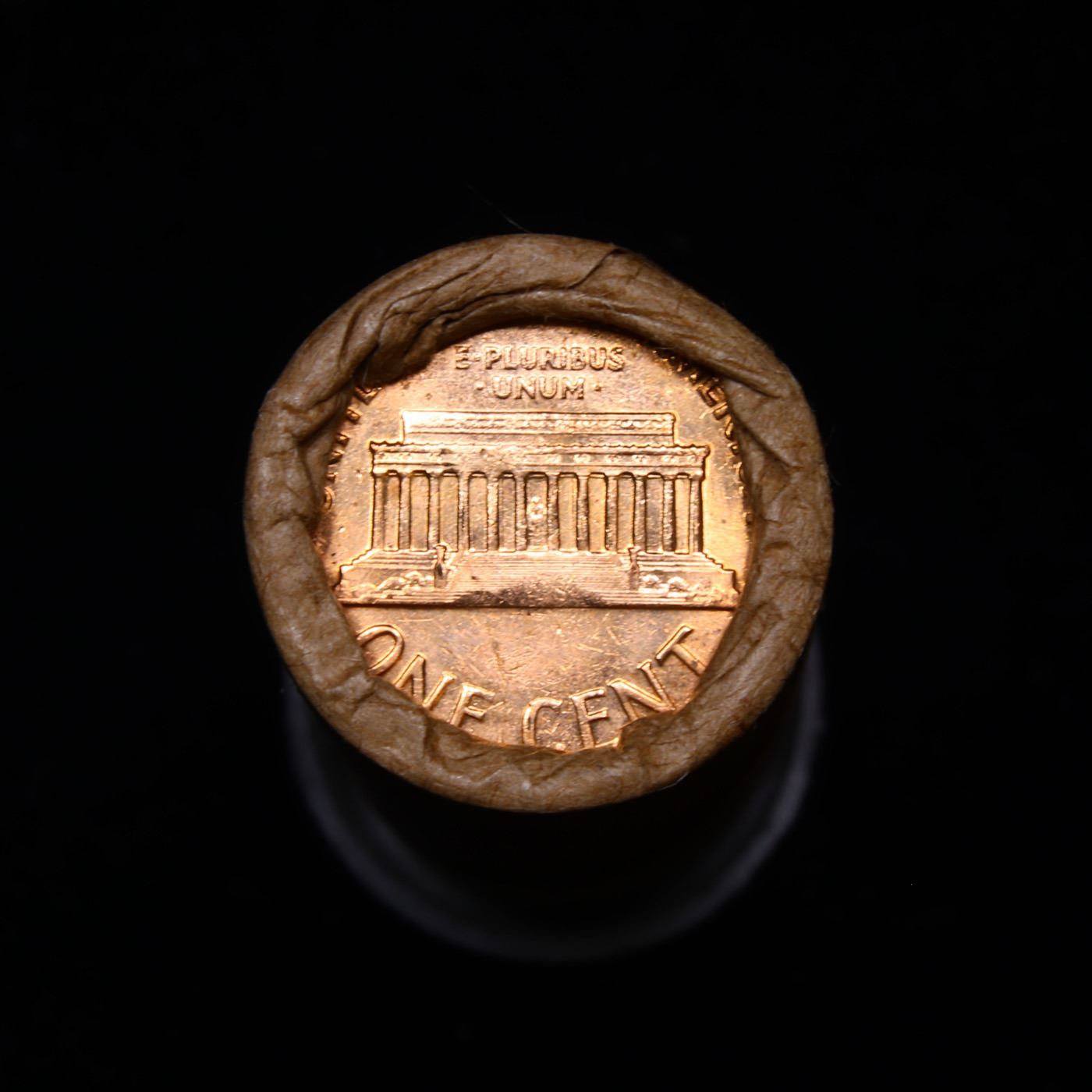 Uncirculated Shotgun Lincoln 1c roll, 1964-d 50 pcs Brandt Wrapper. A terrific Shotgun roll of Lincoln cents. All coins cherry red. Trends ms65 rd $15 Estimate $750