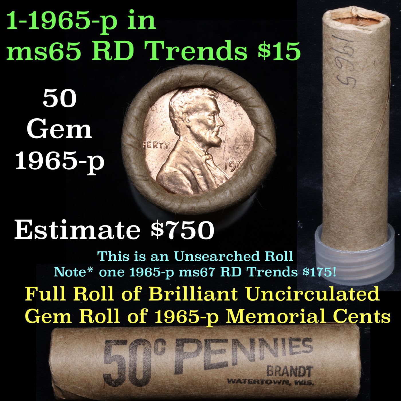 Uncirculated Shotgun Lincoln 1c roll, 1965-p 50 pcs Brinks Wrapper Grades