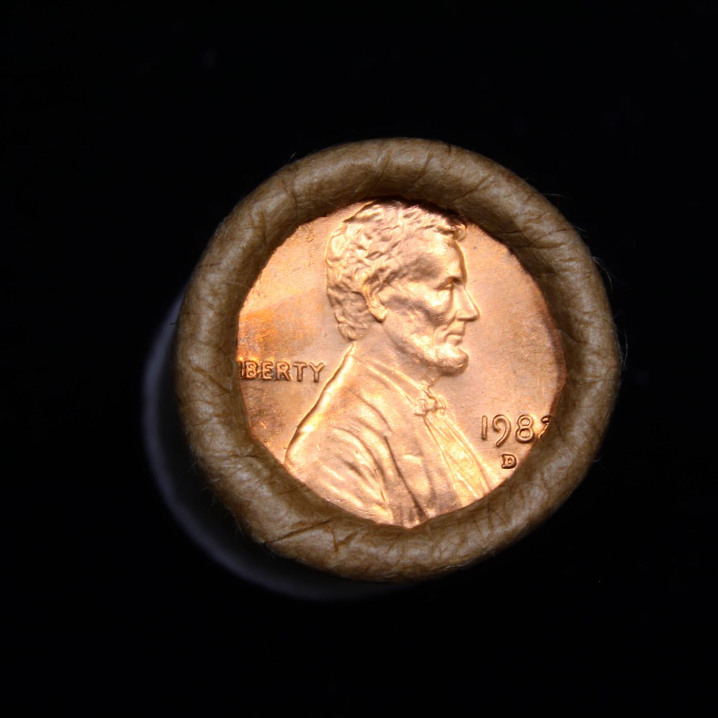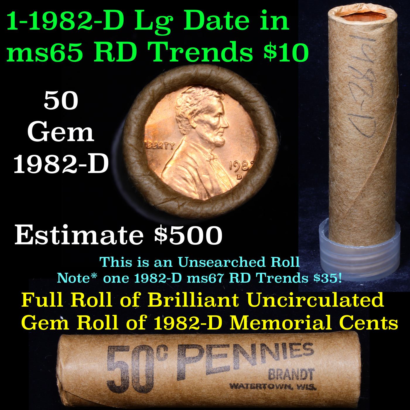 Uncirculated Shotgun Lincoln 1c roll, 1982-d Lg date, 50 pcs Brandt Wrapper . A terrific Shotgun roll of Lincoln cents. All coins cherry red. Trends ms65 rd $10. Estimate $500