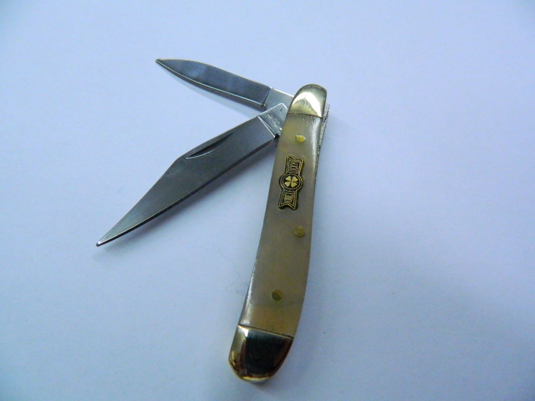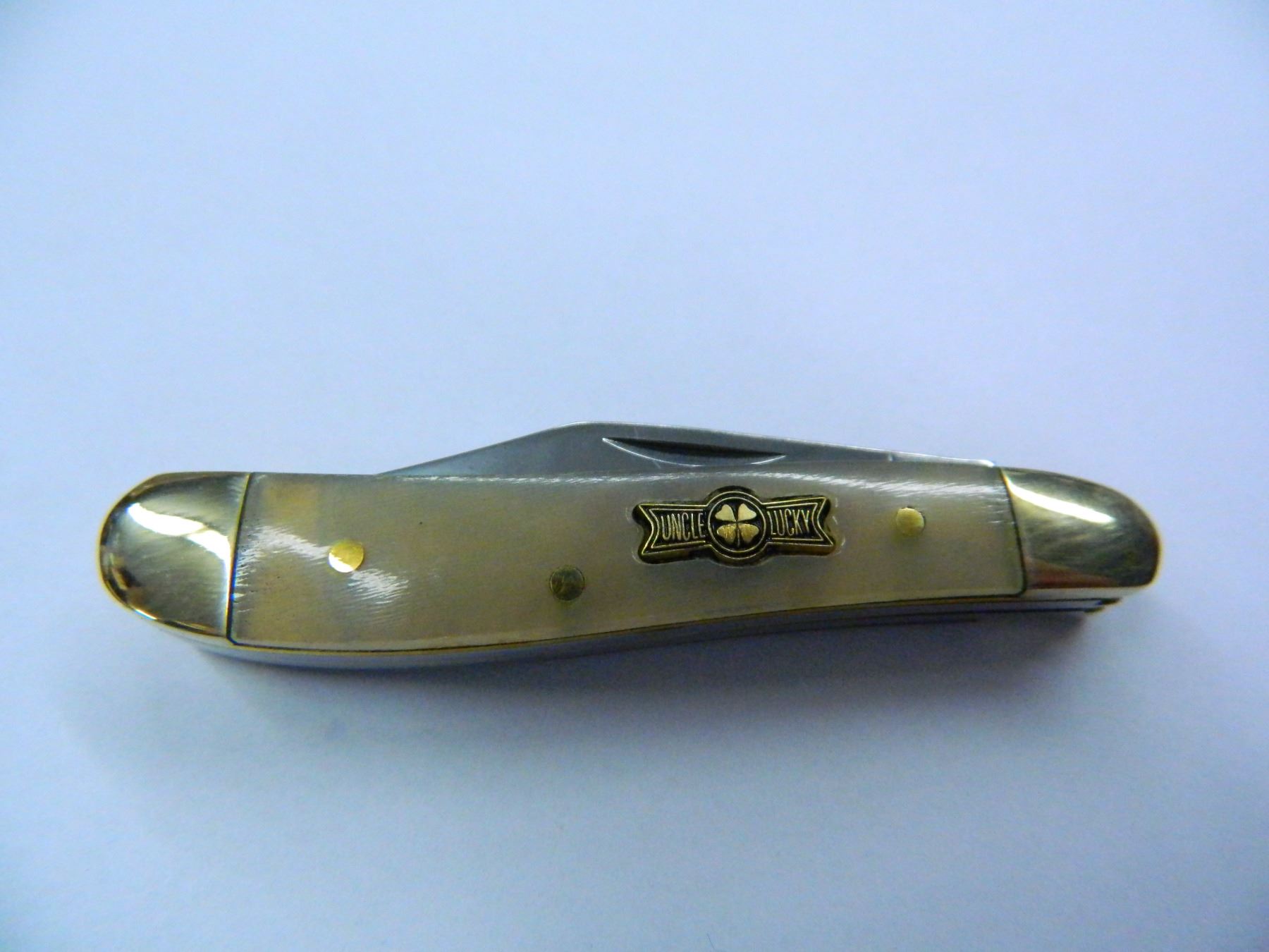 2 7/8" closed. Stainless clip and pen blades. Ox horn handles with nickel silver bolsters and Uncle Lucky inlay shield.