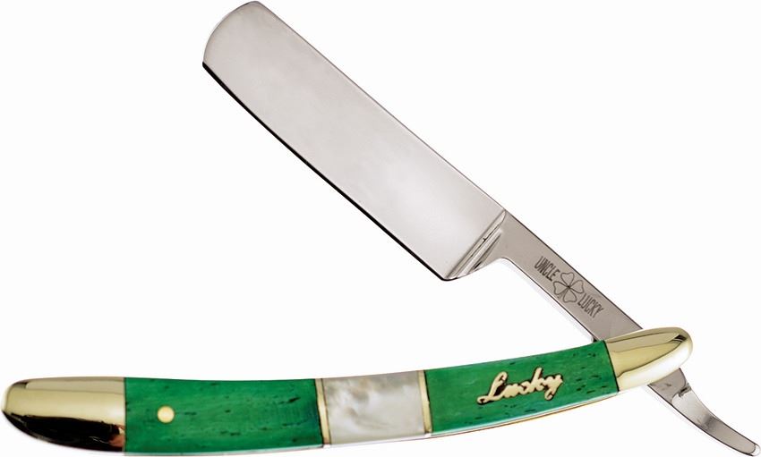 4" closed. 3" stainless razor blade. Smooth green bone and Mother of Pearl handles with nickel silver bolsters and inlay shield.