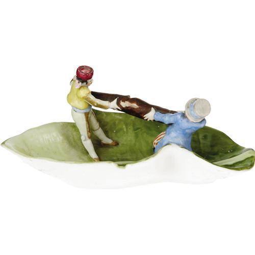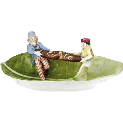 <B>Uncle Sam Porcelain Figural Cigar Tray.</B></I> Unattributed and in majolica style, this figural cigar tray/ashtray shows Uncle Sam and a matador pulling a cigar marked "Cuba" in half. Both figures appear to be standing on a tobacco leaf. Nicely colored and in excellent condition, this novelty item gives a turn-of -the-century appearance.
