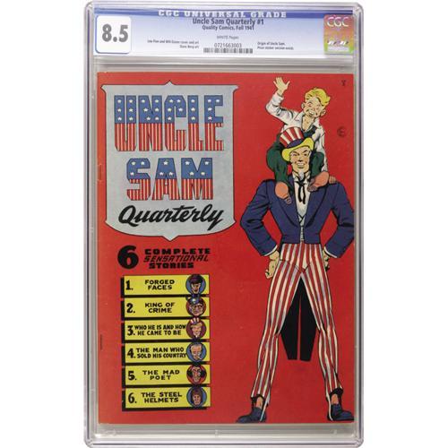 <B>Uncle Sam Quarterly #1 (Quality, 1941) CGC VF+ 8.5 White pages.</B></I> This copy may have been read <I>once</B></I>, carefully at that! It ranks with the best we've seen. The cover art is credited to Will Eisner and Lou Fine. Note that this is the regular edition with no price sticker. Overstreet 2006 VF 8.0 value = $2,477; VF/NM 9.0 value = $4,189. CGC census 10/06: 2 in 8.5, 1 higher.<BR><BR><b>Shipping:</b> Slabbed Comic (<a target="_blank" href="http://www.heritageauctions.com/common/shipping.php">view shipping information</a>)