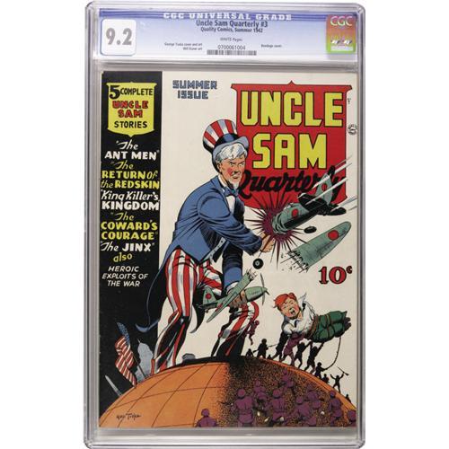<B>Uncle Sam Quarterly #3 (Quality, 1942) CGC NM- 9.2 White pages.</B></I> George Tuska rendered this issue's cover featuring the character who embodies America. Will Eisner added interior art to the issue. Overstreet 2006 NM- 9.2 value = $1,325. CGC census 10/06: 2 in 9.2, none higher.<BR><BR><b>Shipping:</b> Slabbed Comic (<a target="_blank" href="http://www.heritageauctions.com/common/shipping.php">view shipping information</a>)