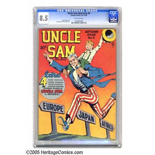 <B>Uncle Sam Quarterly #8 (Quality, 1943) CGC VF+ 8.5 White pages.</B></I> This was the last issue of this title before the name changed to <B>Blackhawk</B></I>. The cover is by Alex Kotzky. Overstreet 2005 VF 8.0 value = $431; VF/NM 9.0 value = $666. CGC census 12/05: 1 in 8.5, none higher.