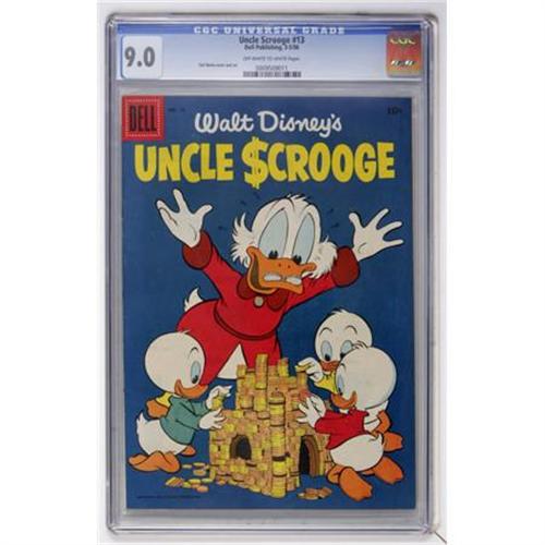 <B>Uncle Scrooge #13 (Dell, 1956) CGC VF/NM 9.0 Off-white to white pages.</B></I> Another sterling issue to add to your Carl Barks collection. The "good duck" artist handled cover and interior art for this early issue. It's also one of the finest copies known. Overstreet 2007 VF/NM 9.0 value = $186; NM- 9.2 value = $260. CGC census 6/07: 3 in 9.0, 2 higher. <I> From the Warren Hall Collection.</B></I><BR><BR><b>Shipping:</b> Comics - Slabbed (certified) (<a target="_blank" href="http://www.heritageauctions.com/common/shipping.php">view shipping information</a>)
