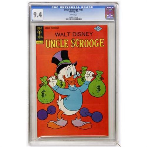 <B>Uncle Scrooge #137 (Gold Key, 1977) CGC NM 9.4 White pages.</B></I> Overstreet 2007 NM- 9.2 value = $35. CGC census 5/07: 1 in 9.4, 1 higher.<BR><BR><b>Shipping:</b> Comics - Slabbed (certified) (<a target="_blank" href="http://www.heritageauctions.com/common/shipping.php">view shipping information</a>)