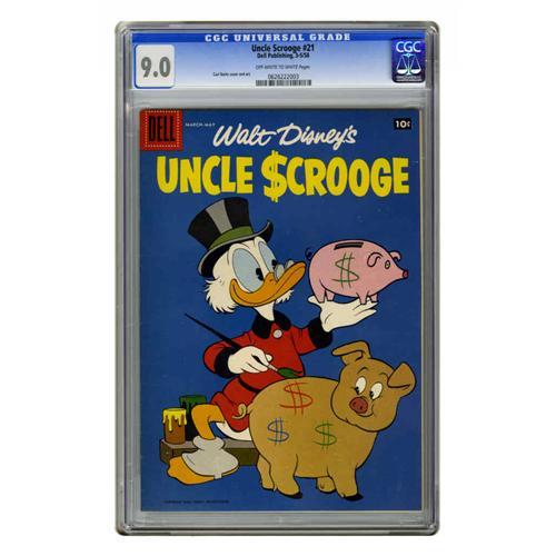 <B>Uncle Scrooge #21 (Dell, 1958) CGC VF/NM 9.0 Off-white to white pages.</B></I> Carl Barks cover and art. Overstreet 2005 VF/NM 9.0 value = $141; NM- 9.2 value = $190. CGC census 11/05: 1 in 9.0, none higher.