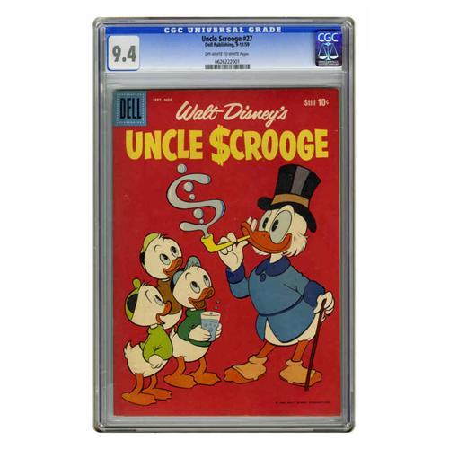<B>Uncle Scrooge #27 (Dell, 1959) CGC NM 9.4 Off-white to white pages.</B></I> Carl Barks cover and art. Overstreet 2005 NM- 9.2 value = $190. CGC census 11/05: 1 in 9.4, none higher.