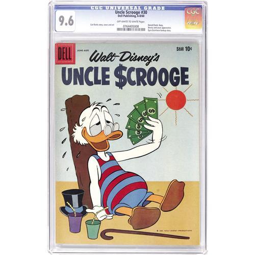 <B>Uncle Scrooge #30 (Dell, 1960) CGC NM+ 9.6 Off-white to white pages.</B></I> Carl Barks provided cover and interior art for this issue. Gyro Gearloose stars in a backup feature. Overstreet 2006 NM- 9.2 value = $200. CGC census 6/06: 1 in 9.6, none higher. <BR><BR><B>Important notice:</B> Heritage usually auctions material at the rate of 200-250 lots per hour. On some occasions eBay Live bid software or the Internet may not be able to keep up with the pace of the auction. We recommend placing a realistic absentee bid now as insurance to avoid disappointment. Occasionally the auctioneer may eliminate or reject an eBay Live bid, and the auctioneer may also reopen a lot after the close of the eBay live bidding (usually because we missed an audience bid), and may reject your bid even if it shows you as the winning bidder. By bidding via eBay Live, you agree that Heritage may award the lot to another bidder at its sole discretion under the circumstances described above or any other reasonable circumstances. Since eBay bids are not shown to us until we open the lot on the floor, we treat those bids just like floor bids. In most cases the floor responds before the eBay bid is presented to us, due to Internet lag time, so for consistency we have made it a policy that floor bids are always considered first over tie eBay live bids. Also please note that all Heritage lots purchased through eBay Live carry a 22.5% Buyer's Premium. Please make sure you read the Terms and Conditions before you bid. This lot is being auctioned in conjunction with a live floor auction by Heritage Auction Galleries. All final auction and invoice information will be supplied by Heritage Auction Galleries, and all other information should be considered preliminary. Lot:41001 <BR><BR><B>Winning Notification and Billing:</B> After the FINAL session in this auction is complete, Heritage will send e-mail and snail mail invoices. This process normally takes several days. All final auction and invoice information will be supplied by Heritage Auction Galleries, and all other information should be considered preliminary. <BR><BR>This auction will be conducted on a live auction floor and over the Internet through eBay Live. If you choose to place an absentee bid, please take a moment to <font color='#0000ff'><u><a href='http://pages.ebay.com/liveauctions/help/before/laabsentee.html'>learn how eBay Live absentee bidding works</a></u></font><font color='#000000'>