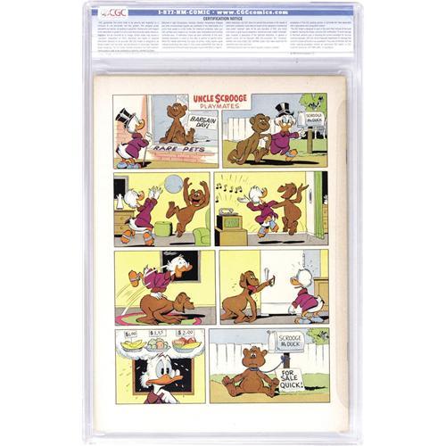 <B>Uncle Scrooge #38 (Dell, 1962) CGC NM 9.4 Off-white pages.</B></I> The gang's all here in this issue: Uncle Scrooge (drawn by Carl Barks), the Beagle Boys, Gyro Gearloose, Magica DeSpell, and as ever, Donald and his nephews too. Overstreet 2006 NM- 9.2 value = $170. CGC census 6/06: 1 in 9.4, none higher. <BR><BR><B>Important notice:</B> Heritage usually auctions material at the rate of 200-250 lots per hour. On some occasions eBay Live bid software or the Internet may not be able to keep up with the pace of the auction. We recommend placing a realistic absentee bid now as insurance to avoid disappointment. Occasionally the auctioneer may eliminate or reject an eBay Live bid, and the auctioneer may also reopen a lot after the close of the eBay live bidding (usually because we missed an audience bid), and may reject your bid even if it shows you as the winning bidder. By bidding via eBay Live, you agree that Heritage may award the lot to another bidder at its sole discretion under the circumstances described above or any other reasonable circumstances. Since eBay bids are not shown to us until we open the lot on the floor, we treat those bids just like floor bids. In most cases the floor responds before the eBay bid is presented to us, due to Internet lag time, so for consistency we have made it a policy that floor bids are always considered first over tie eBay live bids. Also please note that all Heritage lots purchased through eBay Live carry a 22.5% Buyer's Premium. Please make sure you read the Terms and Conditions before you bid. This lot is being auctioned in conjunction with a live floor auction by Heritage Auction Galleries. All final auction and invoice information will be supplied by Heritage Auction Galleries, and all other information should be considered preliminary. Lot:41001 <BR><BR><B>Winning Notification and Billing:</B> After the FINAL session in this auction is complete, Heritage will send e-mail and snail mail invoices. This process normally takes several days. All final auction and invoice information will be supplied by Heritage Auction Galleries, and all other information should be considered preliminary. <BR><BR>This auction will be conducted on a live auction floor and over the Internet through eBay Live. If you choose to place an absentee bid, please take a moment to <font color='#0000ff'><u><a href='http://pages.ebay.com/liveauctions/help/before/laabsentee.html'>learn how eBay Live absentee bidding works</a></u></font><font color='#000000'>