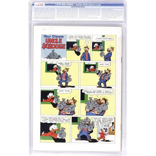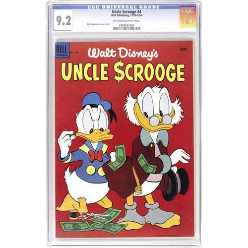 <B>Uncle Scrooge #4 (Dell, 1953) CGC NM- 9.2 Off-white to white pages.</B></I> Here's the first issue of this very collectible title (it began with #4 because Scrooge's three <B>Four Color</B></I> issues were considered #1-3)! In the story, Scrooge attempts to hide his money in cans he's shipping to a remote island, but the Beagle Boys have other plans for the loot, and it'll take ingenuity by Donald's nephews to bail Scrooge out of the mess! That's the premise of the tale "Hawaiian Hideaway," written and drawn by Carl Barks. Overstreet 2006 NM- 9.2 value = $600. CGC census 6/06: 2 in 9.2, none higher. <BR><BR><B>Important notice:</B> Heritage usually auctions material at the rate of 200-250 lots per hour. On some occasions eBay Live bid software or the Internet may not be able to keep up with the pace of the auction. We recommend placing a realistic absentee bid now as insurance to avoid disappointment. Occasionally the auctioneer may eliminate or reject an eBay Live bid, and the auctioneer may also reopen a lot after the close of the eBay live bidding (usually because we missed an audience bid), and may reject your bid even if it shows you as the winning bidder. By bidding via eBay Live, you agree that Heritage may award the lot to another bidder at its sole discretion under the circumstances described above or any other reasonable circumstances. Since eBay bids are not shown to us until we open the lot on the floor, we treat those bids just like floor bids. In most cases the floor responds before the eBay bid is presented to us, due to Internet lag time, so for consistency we have made it a policy that floor bids are always considered first over tie eBay live bids. Also please note that all Heritage lots purchased through eBay Live carry a 22.5% Buyer's Premium. Please make sure you read the Terms and Conditions before you bid. This lot is being auctioned in conjunction with a live floor auction by Heritage Auction Galleries. All final auction and invoice information will be supplied by Heritage Auction Galleries, and all other information should be considered preliminary. Lot:41001 <BR><BR><B>Winning Notification and Billing:</B> After the FINAL session in this auction is complete, Heritage will send e-mail and snail mail invoices. This process normally takes several days. All final auction and invoice information will be supplied by Heritage Auction Galleries, and all other information should be considered preliminary. <BR><BR>This auction will be conducted on a live auction floor and over the Internet through eBay Live. If you choose to place an absentee bid, please take a moment to <font color='#0000ff'><u><a href='http://pages.ebay.com/liveauctions/help/before/laabsentee.html'>learn how eBay Live absentee bidding works</a></u></font><font color='#000000'>