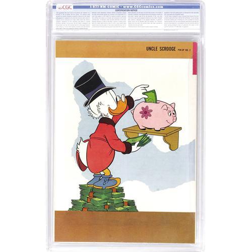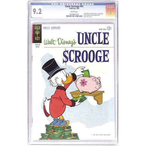 <B>Uncle Scrooge #41 (Gold Key, 1963) CGC NM- 9.2 White pages.</B></I> In "The Status Seeker," Scrooge becomes interested in acquiring the world's top status symbol, the Candy-Striped Ruby. This copy's a status symbol in itself as the sole 9.2 yet certified. Overstreet 2006 NM- 9.2 value = $140. CGC census 6/06: 1 in 9.2, none higher. <BR><BR><B>Important notice:</B> Heritage usually auctions material at the rate of 200-250 lots per hour. On some occasions eBay Live bid software or the Internet may not be able to keep up with the pace of the auction. We recommend placing a realistic absentee bid now as insurance to avoid disappointment. Occasionally the auctioneer may eliminate or reject an eBay Live bid, and the auctioneer may also reopen a lot after the close of the eBay live bidding (usually because we missed an audience bid), and may reject your bid even if it shows you as the winning bidder. By bidding via eBay Live, you agree that Heritage may award the lot to another bidder at its sole discretion under the circumstances described above or any other reasonable circumstances. Since eBay bids are not shown to us until we open the lot on the floor, we treat those bids just like floor bids. In most cases the floor responds before the eBay bid is presented to us, due to Internet lag time, so for consistency we have made it a policy that floor bids are always considered first over tie eBay live bids. Also please note that all Heritage lots purchased through eBay Live carry a 22.5% Buyer's Premium. Please make sure you read the Terms and Conditions before you bid. This lot is being auctioned in conjunction with a live floor auction by Heritage Auction Galleries. All final auction and invoice information will be supplied by Heritage Auction Galleries, and all other information should be considered preliminary. Lot:41001 <BR><BR><B>Winning Notification and Billing:</B> After the FINAL session in this auction is complete, Heritage will send e-mail and snail mail invoices. This process normally takes several days. All final auction and invoice information will be supplied by Heritage Auction Galleries, and all other information should be considered preliminary. <BR><BR>This auction will be conducted on a live auction floor and over the Internet through eBay Live. If you choose to place an absentee bid, please take a moment to <font color='#0000ff'><u><a href='http://pages.ebay.com/liveauctions/help/before/laabsentee.html'>learn how eBay Live absentee bidding works</a></u></font><font color='#000000'>