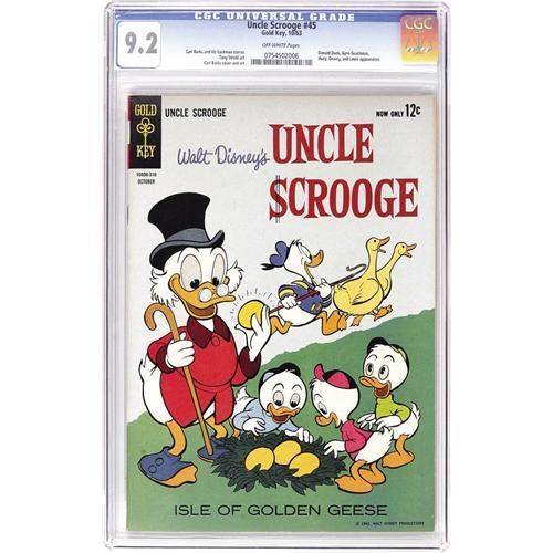 <B>Uncle Scrooge #45 (Gold Key, 1963) CGC NM- 9.2 Off-white pages.</B></I> As the only copy of this issue graded above VF by CGC to date, this specimen will be one to go after for just about every comic fan who loves Carl Barks, which means just about every comic fan! Barks supplied the cover and some interior art for the issue. Gyro Gearloose appears in the book, as do Donald, Huey, Dewey, and Louie. Overstreet 2006 NM- 9.2 value = $140. CGC census 5/06: 1 in 9.2, none higher. <BR><BR><B>Important notice:</B> Heritage usually auctions material at the rate of 200-250 lots per hour. On some occasions eBay Live bid software or the Internet may not be able to keep up with the pace of the auction. We recommend placing a realistic absentee bid now as insurance to avoid disappointment. Occasionally the auctioneer may eliminate or reject an eBay Live bid, and the auctioneer may also reopen a lot after the close of the eBay live bidding (usually because we missed an audience bid), and may reject your bid even if it shows you as the winning bidder. By bidding via eBay Live, you agree that Heritage may award the lot to another bidder at its sole discretion under the circumstances described above or any other reasonable circumstances. Since eBay bids are not shown to us until we open the lot on the floor, we treat those bids just like floor bids. In most cases the floor responds before the eBay bid is presented to us, due to Internet lag time, so for consistency we have made it a policy that floor bids are always considered first over tie eBay live bids. Also please note that all Heritage lots purchased through eBay Live carry a 22.5% Buyer's Premium. Please make sure you read the Terms and Conditions before you bid. This lot is being auctioned in conjunction with a live floor auction by Heritage Auction Galleries. All final auction and invoice information will be supplied by Heritage Auction Galleries, and all other information should be considered preliminary. Lot:41001 <BR><BR><B>Winning Notification and Billing:</B> After the FINAL session in this auction is complete, Heritage will send e-mail and snail mail invoices. This process normally takes several days. All final auction and invoice information will be supplied by Heritage Auction Galleries, and all other information should be considered preliminary. <BR><BR>This auction will be conducted on a live auction floor and over the Internet through eBay Live. If you choose to place an absentee bid, please take a moment to <font color='#0000ff'><u><a href='http://pages.ebay.com/liveauctions/help/before/laabsentee.html'>learn how eBay Live absentee bidding works</a></u></font><font color='#000000'>