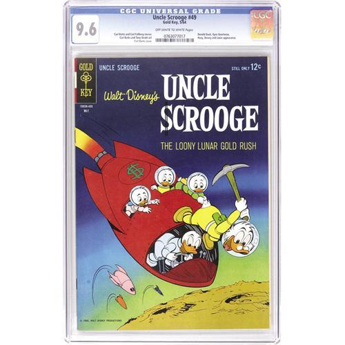 <B>Uncle Scrooge #49 (Gold Key, 1964) CGC NM+ 9.6 Off-white to white pages.</B></I> This book would be an upgrade for <I>any</B></I> Scrooge collection - not only is it the only 9.6 yet certified, the next-highest book as of this writing is a 9.2. Carl Barks provided the cover and interior art. Overstreet 2006 NM- 9.2 value = $140. CGC census 6/06: 1 in 9.6, none higher. <BR><BR><B>Important notice:</B> Heritage usually auctions material at the rate of 200-250 lots per hour. On some occasions eBay Live bid software or the Internet may not be able to keep up with the pace of the auction. We recommend placing a realistic absentee bid now as insurance to avoid disappointment. Occasionally the auctioneer may eliminate or reject an eBay Live bid, and the auctioneer may also reopen a lot after the close of the eBay live bidding (usually because we missed an audience bid), and may reject your bid even if it shows you as the winning bidder. By bidding via eBay Live, you agree that Heritage may award the lot to another bidder at its sole discretion under the circumstances described above or any other reasonable circumstances. Since eBay bids are not shown to us until we open the lot on the floor, we treat those bids just like floor bids. In most cases the floor responds before the eBay bid is presented to us, due to Internet lag time, so for consistency we have made it a policy that floor bids are always considered first over tie eBay live bids. Also please note that all Heritage lots purchased through eBay Live carry a 22.5% Buyer's Premium. Please make sure you read the Terms and Conditions before you bid. This lot is being auctioned in conjunction with a live floor auction by Heritage Auction Galleries. All final auction and invoice information will be supplied by Heritage Auction Galleries, and all other information should be considered preliminary. Lot:41001 <BR><BR><B>Winning Notification and Billing:</B> After the FINAL session in this auction is complete, Heritage will send e-mail and snail mail invoices. This process normally takes several days. All final auction and invoice information will be supplied by Heritage Auction Galleries, and all other information should be considered preliminary. <BR><BR>This auction will be conducted on a live auction floor and over the Internet through eBay Live. If you choose to place an absentee bid, please take a moment to <font color='#0000ff'><u><a href='http://pages.ebay.com/liveauctions/help/before/laabsentee.html'>learn how eBay Live absentee bidding works</a></u></font><font color='#000000'>
