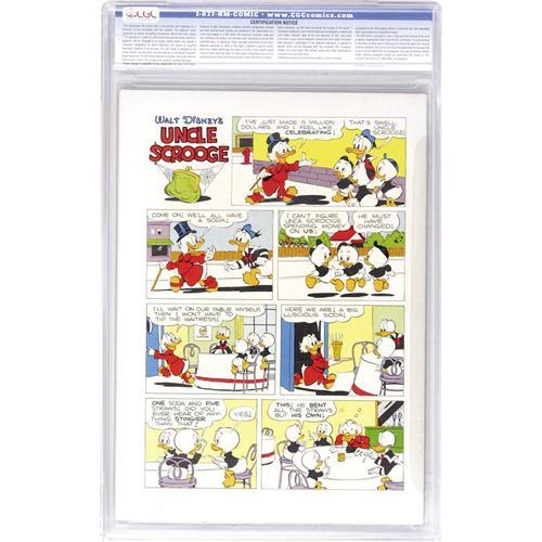 <B>Uncle Scrooge #5 (Dell, 1954) CGC NM 9.4 Off-white to white pages.</B></I> The first appearance of Scrooge's Worry Room also sees the first appearance of the Junior Woodchucks' Book of Knowledge, later known as the Junior Woodchucks' Guidebook that Huey, Dewey, and Louie were always quick to consult. The plot of the tale "The Sunken City" is memorable too, with Scrooge buying up every 1916 quarter ever minted! This is the only copy graded above VF/NM 9.0 by CGC to date. Overstreet 2006 NM- 9.2 value = $485. CGC census 6/06: 1 in 9.4, none higher. <BR><BR><B>Important notice:</B> Heritage usually auctions material at the rate of 200-250 lots per hour. On some occasions eBay Live bid software or the Internet may not be able to keep up with the pace of the auction. We recommend placing a realistic absentee bid now as insurance to avoid disappointment. Occasionally the auctioneer may eliminate or reject an eBay Live bid, and the auctioneer may also reopen a lot after the close of the eBay live bidding (usually because we missed an audience bid), and may reject your bid even if it shows you as the winning bidder. By bidding via eBay Live, you agree that Heritage may award the lot to another bidder at its sole discretion under the circumstances described above or any other reasonable circumstances. Since eBay bids are not shown to us until we open the lot on the floor, we treat those bids just like floor bids. In most cases the floor responds before the eBay bid is presented to us, due to Internet lag time, so for consistency we have made it a policy that floor bids are always considered first over tie eBay live bids. Also please note that all Heritage lots purchased through eBay Live carry a 22.5% Buyer's Premium. Please make sure you read the Terms and Conditions before you bid. This lot is being auctioned in conjunction with a live floor auction by Heritage Auction Galleries. All final auction and invoice information will be supplied by Heritage Auction Galleries, and all other information should be considered preliminary. Lot:41001 <BR><BR><B>Winning Notification and Billing:</B> After the FINAL session in this auction is complete, Heritage will send e-mail and snail mail invoices. This process normally takes several days. All final auction and invoice information will be supplied by Heritage Auction Galleries, and all other information should be considered preliminary. <BR><BR>This auction will be conducted on a live auction floor and over the Internet through eBay Live. If you choose to place an absentee bid, please take a moment to <font color='#0000ff'><u><a href='http://pages.ebay.com/liveauctions/help/before/laabsentee.html'>learn how eBay Live absentee bidding works</a></u></font><font color='#000000'>