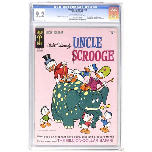 <B>Uncle Scrooge #54 (Gold Key, 1964) CGC NM- 9.2 Off-white to white pages.</B></I> Carl Barks cover and art. Gyro Gearloose appearance. Overstreet 2006 NM- 9.2 value = $140. CGC census 5/06: 1 in 9.2, 1 higher. <BR><BR><B>Important notice:</B> Heritage usually auctions material at the rate of 200-250 lots per hour. On some occasions eBay Live bid software or the Internet may not be able to keep up with the pace of the auction. We recommend placing a realistic absentee bid now as insurance to avoid disappointment. Occasionally the auctioneer may eliminate or reject an eBay Live bid, and the auctioneer may also reopen a lot after the close of the eBay live bidding (usually because we missed an audience bid), and may reject your bid even if it shows you as the winning bidder. By bidding via eBay Live, you agree that Heritage may award the lot to another bidder at its sole discretion under the circumstances described above or any other reasonable circumstances. Since eBay bids are not shown to us until we open the lot on the floor, we treat those bids just like floor bids. In most cases the floor responds before the eBay bid is presented to us, due to Internet lag time, so for consistency we have made it a policy that floor bids are always considered first over tie eBay live bids. Also please note that all Heritage lots purchased through eBay Live carry a 22.5% Buyer's Premium. Please make sure you read the Terms and Conditions before you bid. This lot is being auctioned in conjunction with a live floor auction by Heritage Auction Galleries. All final auction and invoice information will be supplied by Heritage Auction Galleries, and all other information should be considered preliminary. Lot:41001 <BR><BR><B>Winning Notification and Billing:</B> After the FINAL session in this auction is complete, Heritage will send e-mail and snail mail invoices. This process normally takes several days. All final auction and invoice information will be supplied by Heritage Auction Galleries, and all other information should be considered preliminary. <BR><BR>This auction will be conducted on a live auction floor and over the Internet through eBay Live. If you choose to place an absentee bid, please take a moment to <font color='#0000ff'><u><a href='http://pages.ebay.com/liveauctions/help/before/laabsentee.html'>learn how eBay Live absentee bidding works</a></u></font><font color='#000000'>