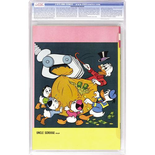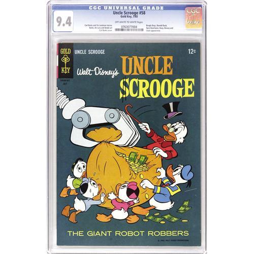 <B>Uncle Scrooge #58 (Gold Key, 1965) CGC NM 9.4 Off-white to white pages.</B></I> If robot covers are your thing, here's one to go after, but be forewarned that many a Scrooge collector and Carl Barks enthusiast will be vying for this copy as well - it's CGC's sole highest-graded copy as of this writing. Overstreet 2006 NM- 9.2 value = $140. CGC census 6/06: 1 in 9.4, none higher. <BR><BR><B>Important notice:</B> Heritage usually auctions material at the rate of 200-250 lots per hour. On some occasions eBay Live bid software or the Internet may not be able to keep up with the pace of the auction. We recommend placing a realistic absentee bid now as insurance to avoid disappointment. Occasionally the auctioneer may eliminate or reject an eBay Live bid, and the auctioneer may also reopen a lot after the close of the eBay live bidding (usually because we missed an audience bid), and may reject your bid even if it shows you as the winning bidder. By bidding via eBay Live, you agree that Heritage may award the lot to another bidder at its sole discretion under the circumstances described above or any other reasonable circumstances. Since eBay bids are not shown to us until we open the lot on the floor, we treat those bids just like floor bids. In most cases the floor responds before the eBay bid is presented to us, due to Internet lag time, so for consistency we have made it a policy that floor bids are always considered first over tie eBay live bids. Also please note that all Heritage lots purchased through eBay Live carry a 22.5% Buyer's Premium. Please make sure you read the Terms and Conditions before you bid. This lot is being auctioned in conjunction with a live floor auction by Heritage Auction Galleries. All final auction and invoice information will be supplied by Heritage Auction Galleries, and all other information should be considered preliminary. Lot:41001 <BR><BR><B>Winning Notification and Billing:</B> After the FINAL session in this auction is complete, Heritage will send e-mail and snail mail invoices. This process normally takes several days. All final auction and invoice information will be supplied by Heritage Auction Galleries, and all other information should be considered preliminary. <BR><BR>This auction will be conducted on a live auction floor and over the Internet through eBay Live. If you choose to place an absentee bid, please take a moment to <font color='#0000ff'><u><a href='http://pages.ebay.com/liveauctions/help/before/laabsentee.html'>learn how eBay Live absentee bidding works</a></u></font><font color='#000000'>