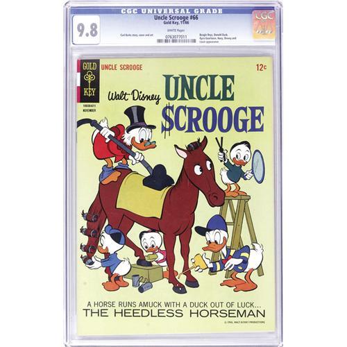 <B>Uncle Scrooge #66 (Gold Key, 1966) CGC NM/MT 9.8 White pages.</B></I> We'd never seen a <B>Scrooge</B></I> issue number this <I>low</B></I> with a grade this <I>high</B></I>! It's the highest-graded copy in CGC's census, natch. Carl Barks provided the story, cover, and interior art. Overstreet 2006 NM- 9.2 value = $125. CGC census 6/06: 1 in 9.8, none higher. <BR><BR><B>Important notice:</B> Heritage usually auctions material at the rate of 200-250 lots per hour. On some occasions eBay Live bid software or the Internet may not be able to keep up with the pace of the auction. We recommend placing a realistic absentee bid now as insurance to avoid disappointment. Occasionally the auctioneer may eliminate or reject an eBay Live bid, and the auctioneer may also reopen a lot after the close of the eBay live bidding (usually because we missed an audience bid), and may reject your bid even if it shows you as the winning bidder. By bidding via eBay Live, you agree that Heritage may award the lot to another bidder at its sole discretion under the circumstances described above or any other reasonable circumstances. Since eBay bids are not shown to us until we open the lot on the floor, we treat those bids just like floor bids. In most cases the floor responds before the eBay bid is presented to us, due to Internet lag time, so for consistency we have made it a policy that floor bids are always considered first over tie eBay live bids. Also please note that all Heritage lots purchased through eBay Live carry a 22.5% Buyer's Premium. Please make sure you read the Terms and Conditions before you bid. This lot is being auctioned in conjunction with a live floor auction by Heritage Auction Galleries. All final auction and invoice information will be supplied by Heritage Auction Galleries, and all other information should be considered preliminary. Lot:41001 <BR><BR><B>Winning Notification and Billing:</B> After the FINAL session in this auction is complete, Heritage will send e-mail and snail mail invoices. This process normally takes several days. All final auction and invoice information will be supplied by Heritage Auction Galleries, and all other information should be considered preliminary. <BR><BR>This auction will be conducted on a live auction floor and over the Internet through eBay Live. If you choose to place an absentee bid, please take a moment to <font color='#0000ff'><u><a href='http://pages.ebay.com/liveauctions/help/before/laabsentee.html'>learn how eBay Live absentee bidding works</a></u></font><font color='#000000'>