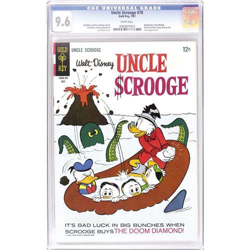 <B>Uncle Scrooge #70 (Gold Key, 1967) CGC NM+ 9.6 White pages.</B></I> As of this writing, this is the only copy of the issue graded higher than 9.2 by CGC. It's the second-to-last issue to have an original Carl Barks story. Overstreet 2006 NM- 9.2 value = $125. CGC census 6/06: 1 in 9.6, none higher. <BR><BR><B>Important notice:</B> Heritage usually auctions material at the rate of 200-250 lots per hour. On some occasions eBay Live bid software or the Internet may not be able to keep up with the pace of the auction. We recommend placing a realistic absentee bid now as insurance to avoid disappointment. Occasionally the auctioneer may eliminate or reject an eBay Live bid, and the auctioneer may also reopen a lot after the close of the eBay live bidding (usually because we missed an audience bid), and may reject your bid even if it shows you as the winning bidder. By bidding via eBay Live, you agree that Heritage may award the lot to another bidder at its sole discretion under the circumstances described above or any other reasonable circumstances. Since eBay bids are not shown to us until we open the lot on the floor, we treat those bids just like floor bids. In most cases the floor responds before the eBay bid is presented to us, due to Internet lag time, so for consistency we have made it a policy that floor bids are always considered first over tie eBay live bids. Also please note that all Heritage lots purchased through eBay Live carry a 22.5% Buyer's Premium. Please make sure you read the Terms and Conditions before you bid. This lot is being auctioned in conjunction with a live floor auction by Heritage Auction Galleries. All final auction and invoice information will be supplied by Heritage Auction Galleries, and all other information should be considered preliminary. Lot:41001 <BR><BR><B>Winning Notification and Billing:</B> After the FINAL session in this auction is complete, Heritage will send e-mail and snail mail invoices. This process normally takes several days. All final auction and invoice information will be supplied by Heritage Auction Galleries, and all other information should be considered preliminary. <BR><BR>This auction will be conducted on a live auction floor and over the Internet through eBay Live. If you choose to place an absentee bid, please take a moment to <font color='#0000ff'><u><a href='http://pages.ebay.com/liveauctions/help/before/laabsentee.html'>learn how eBay Live absentee bidding works</a></u></font><font color='#000000'>