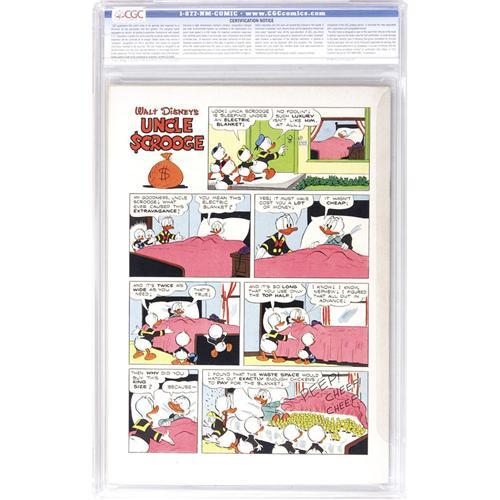 <B>Uncle Scrooge #8 (Dell, 1954) CGC NM- 9.2 Off-white to white pages.</B></I> Gold dust clogging your pores? Not a problem most of us have, but this is the wealthy Uncle Scrooge we're talking about, and in this issue's story "Island of the Petrifying Ray," he takes a sea voyage to unclog his pores, and much adventure and mayhem results. Overstreet 2006 NM- 9.2 value = $275. CGC census 6/06: 2 in 9.2, 1 higher. <BR><BR><B>Important notice:</B> Heritage usually auctions material at the rate of 200-250 lots per hour. On some occasions eBay Live bid software or the Internet may not be able to keep up with the pace of the auction. We recommend placing a realistic absentee bid now as insurance to avoid disappointment. Occasionally the auctioneer may eliminate or reject an eBay Live bid, and the auctioneer may also reopen a lot after the close of the eBay live bidding (usually because we missed an audience bid), and may reject your bid even if it shows you as the winning bidder. By bidding via eBay Live, you agree that Heritage may award the lot to another bidder at its sole discretion under the circumstances described above or any other reasonable circumstances. Since eBay bids are not shown to us until we open the lot on the floor, we treat those bids just like floor bids. In most cases the floor responds before the eBay bid is presented to us, due to Internet lag time, so for consistency we have made it a policy that floor bids are always considered first over tie eBay live bids. Also please note that all Heritage lots purchased through eBay Live carry a 22.5% Buyer's Premium. Please make sure you read the Terms and Conditions before you bid. This lot is being auctioned in conjunction with a live floor auction by Heritage Auction Galleries. All final auction and invoice information will be supplied by Heritage Auction Galleries, and all other information should be considered preliminary. Lot:41001 <BR><BR><B>Winning Notification and Billing:</B> After the FINAL session in this auction is complete, Heritage will send e-mail and snail mail invoices. This process normally takes several days. All final auction and invoice information will be supplied by Heritage Auction Galleries, and all other information should be considered preliminary. <BR><BR>This auction will be conducted on a live auction floor and over the Internet through eBay Live. If you choose to place an absentee bid, please take a moment to <font color='#0000ff'><u><a href='http://pages.ebay.com/liveauctions/help/before/laabsentee.html'>learn how eBay Live absentee bidding works</a></u></font><font color='#000000'>