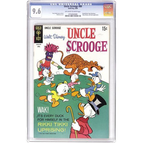 <B>Uncle Scrooge #80 (Gold Key, 1969) CGC NM+ 9.6 Off-white to white pages.</B></I> We've been fortunate to offer lots of high-grade Gold Key lately, but this is the finest copy of this issue we've seen, and CGC's sole highest-graded to date as well. Tony Strobl is credited with the cover and interior art. Overstreet 2006 NM- 9.2 value = $75. CGC census 5/06: 1 in 9.6, none higher. <BR><BR><B>Important notice:</B> Heritage usually auctions material at the rate of 200-250 lots per hour. On some occasions eBay Live bid software or the Internet may not be able to keep up with the pace of the auction. We recommend placing a realistic absentee bid now as insurance to avoid disappointment. Occasionally the auctioneer may eliminate or reject an eBay Live bid, and the auctioneer may also reopen a lot after the close of the eBay live bidding (usually because we missed an audience bid), and may reject your bid even if it shows you as the winning bidder. By bidding via eBay Live, you agree that Heritage may award the lot to another bidder at its sole discretion under the circumstances described above or any other reasonable circumstances. Since eBay bids are not shown to us until we open the lot on the floor, we treat those bids just like floor bids. In most cases the floor responds before the eBay bid is presented to us, due to Internet lag time, so for consistency we have made it a policy that floor bids are always considered first over tie eBay live bids. Also please note that all Heritage lots purchased through eBay Live carry a 22.5% Buyer's Premium. Please make sure you read the Terms and Conditions before you bid. This lot is being auctioned in conjunction with a live floor auction by Heritage Auction Galleries. All final auction and invoice information will be supplied by Heritage Auction Galleries, and all other information should be considered preliminary. Lot:41001 <BR><BR><B>Winning Notification and Billing:</B> After the FINAL session in this auction is complete, Heritage will send e-mail and snail mail invoices. This process normally takes several days. All final auction and invoice information will be supplied by Heritage Auction Galleries, and all other information should be considered preliminary. <BR><BR>This auction will be conducted on a live auction floor and over the Internet through eBay Live. If you choose to place an absentee bid, please take a moment to <font color='#0000ff'><u><a href='http://pages.ebay.com/liveauctions/help/before/laabsentee.html'>learn how eBay Live absentee bidding works</a></u></font><font color='#000000'>