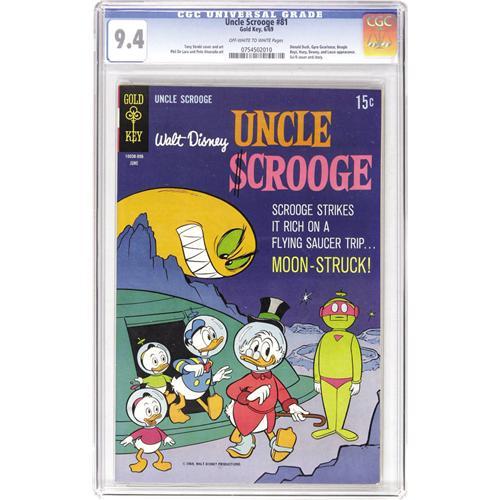 <B>Uncle Scrooge #81 (Gold Key, 1969) CGC NM 9.4 Off-white to white pages.</B></I> UFO cover and story. The Beagle Boys and Gyro Gearloose appear. Tony Strobl cover and art. Overstreet 2006 NM- 9.2 value = $75. CGC census 3/07: 1 in 9.4, none higher. <BR><BR><b>Shipping:</b> Comics - Slabbed (certified) (<a target="_blank" href="http://www.heritageauctions.com/common/shipping.php">view shipping information</a>)