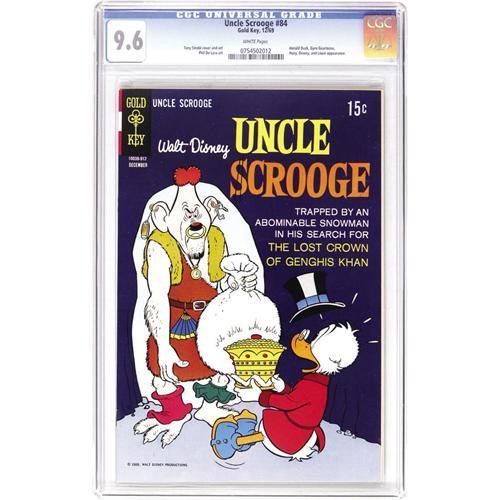 <B>Uncle Scrooge #84 (Gold Key, 1969) CGC NM+ 9.6 White pages.</B></I> Here's the only copy of this issue certified with a grade above 9.2 by CGC as of this writing. And it's got white pages, too! Tony Strobl is credited with the cover art. Gyro Gearloose guest-stars. Overstreet 2006 NM- 9.2 value = $75. CGC census 5/06: 1 in 9.6, none higher. <BR><BR><B>Important notice:</B> Heritage usually auctions material at the rate of 200-250 lots per hour. On some occasions eBay Live bid software or the Internet may not be able to keep up with the pace of the auction. We recommend placing a realistic absentee bid now as insurance to avoid disappointment. Occasionally the auctioneer may eliminate or reject an eBay Live bid, and the auctioneer may also reopen a lot after the close of the eBay live bidding (usually because we missed an audience bid), and may reject your bid even if it shows you as the winning bidder. By bidding via eBay Live, you agree that Heritage may award the lot to another bidder at its sole discretion under the circumstances described above or any other reasonable circumstances. Since eBay bids are not shown to us until we open the lot on the floor, we treat those bids just like floor bids. In most cases the floor responds before the eBay bid is presented to us, due to Internet lag time, so for consistency we have made it a policy that floor bids are always considered first over tie eBay live bids. Also please note that all Heritage lots purchased through eBay Live carry a 22.5% Buyer's Premium. Please make sure you read the Terms and Conditions before you bid. This lot is being auctioned in conjunction with a live floor auction by Heritage Auction Galleries. All final auction and invoice information will be supplied by Heritage Auction Galleries, and all other information should be considered preliminary. Lot:41001 <BR><BR><B>Winning Notification and Billing:</B> After the FINAL session in this auction is complete, Heritage will send e-mail and snail mail invoices. This process normally takes several days. All final auction and invoice information will be supplied by Heritage Auction Galleries, and all other information should be considered preliminary. <BR><BR>This auction will be conducted on a live auction floor and over the Internet through eBay Live. If you choose to place an absentee bid, please take a moment to <font color='#0000ff'><u><a href='http://pages.ebay.com/liveauctions/help/before/laabsentee.html'>learn how eBay Live absentee bidding works</a></u></font><font color='#000000'>