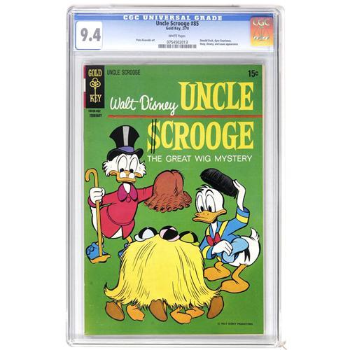 <B>Uncle Scrooge #85 (Gold Key, 1970) CGC NM 9.4 White pages.</B></I> Gyro Gearloose appearance. Pete Alvarado art. Overstreet 2006 NM- 9.2 value = $60. CGC census 5/06: 1 in 9.4, none higher. <BR><BR><B>Important notice:</B> Heritage usually auctions material at the rate of 200-250 lots per hour. On some occasions eBay Live bid software or the Internet may not be able to keep up with the pace of the auction. We recommend placing a realistic absentee bid now as insurance to avoid disappointment. Occasionally the auctioneer may eliminate or reject an eBay Live bid, and the auctioneer may also reopen a lot after the close of the eBay live bidding (usually because we missed an audience bid), and may reject your bid even if it shows you as the winning bidder. By bidding via eBay Live, you agree that Heritage may award the lot to another bidder at its sole discretion under the circumstances described above or any other reasonable circumstances. Since eBay bids are not shown to us until we open the lot on the floor, we treat those bids just like floor bids. In most cases the floor responds before the eBay bid is presented to us, due to Internet lag time, so for consistency we have made it a policy that floor bids are always considered first over tie eBay live bids. Also please note that all Heritage lots purchased through eBay Live carry a 22.5% Buyer's Premium. Please make sure you read the Terms and Conditions before you bid. This lot is being auctioned in conjunction with a live floor auction by Heritage Auction Galleries. All final auction and invoice information will be supplied by Heritage Auction Galleries, and all other information should be considered preliminary. Lot:41001 <BR><BR><B>Winning Notification and Billing:</B> After the FINAL session in this auction is complete, Heritage will send e-mail and snail mail invoices. This process normally takes several days. All final auction and invoice information will be supplied by Heritage Auction Galleries, and all other information should be considered preliminary. <BR><BR>This auction will be conducted on a live auction floor and over the Internet through eBay Live. If you choose to place an absentee bid, please take a moment to <font color='#0000ff'><u><a href='http://pages.ebay.com/liveauctions/help/before/laabsentee.html'>learn how eBay Live absentee bidding works</a></u></font><font color='#000000'>