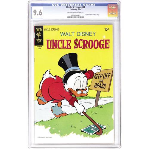 <B>Uncle Scrooge #87 (Gold Key, 1970) CGC NM+ 9.6 Off-white to white pages.</B></I> The folks at Western Publishing opted to recycle the cover of #31 for this issue, but how can you blame 'em when it's Carl Barks art you're talking about? Here's a pristine Gold Key for your bidding pleasure. Overstreet 2006 NM- 9.2 value = $60. CGC census 6/06: 1 in 9.6, none higher. <BR><BR><B>Important notice:</B> Heritage usually auctions material at the rate of 200-250 lots per hour. On some occasions eBay Live bid software or the Internet may not be able to keep up with the pace of the auction. We recommend placing a realistic absentee bid now as insurance to avoid disappointment. Occasionally the auctioneer may eliminate or reject an eBay Live bid, and the auctioneer may also reopen a lot after the close of the eBay live bidding (usually because we missed an audience bid), and may reject your bid even if it shows you as the winning bidder. By bidding via eBay Live, you agree that Heritage may award the lot to another bidder at its sole discretion under the circumstances described above or any other reasonable circumstances. Since eBay bids are not shown to us until we open the lot on the floor, we treat those bids just like floor bids. In most cases the floor responds before the eBay bid is presented to us, due to Internet lag time, so for consistency we have made it a policy that floor bids are always considered first over tie eBay live bids. Also please note that all Heritage lots purchased through eBay Live carry a 22.5% Buyer's Premium. Please make sure you read the Terms and Conditions before you bid. This lot is being auctioned in conjunction with a live floor auction by Heritage Auction Galleries. All final auction and invoice information will be supplied by Heritage Auction Galleries, and all other information should be considered preliminary. Lot:41001 <BR><BR><B>Winning Notification and Billing:</B> After the FINAL session in this auction is complete, Heritage will send e-mail and snail mail invoices. This process normally takes several days. All final auction and invoice information will be supplied by Heritage Auction Galleries, and all other information should be considered preliminary. <BR><BR>This auction will be conducted on a live auction floor and over the Internet through eBay Live. If you choose to place an absentee bid, please take a moment to <font color='#0000ff'><u><a href='http://pages.ebay.com/liveauctions/help/before/laabsentee.html'>learn how eBay Live absentee bidding works</a></u></font><font color='#000000'>