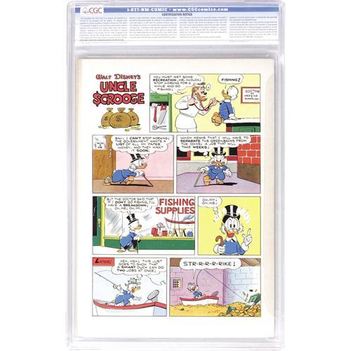 <B>Uncle Scrooge #9 (Dell, 1955) CGC VF/NM 9.0 Off-white to white pages.</B></I> Scrooge has a new safe, and he hides the combination in a locket that accidentally falls around a lemming's neck. The lemming ends up on a schooner headed for Norway, and the chase is on, all drawn in exciting fashion by Carl Barks. Overstreet 2006 VF/NM 9.0 value = $201; NM- 9.2 value = $275. CGC census 6/06: 1 in 9.0, 2 higher. <BR><BR><B>Important notice:</B> Heritage usually auctions material at the rate of 200-250 lots per hour. On some occasions eBay Live bid software or the Internet may not be able to keep up with the pace of the auction. We recommend placing a realistic absentee bid now as insurance to avoid disappointment. Occasionally the auctioneer may eliminate or reject an eBay Live bid, and the auctioneer may also reopen a lot after the close of the eBay live bidding (usually because we missed an audience bid), and may reject your bid even if it shows you as the winning bidder. By bidding via eBay Live, you agree that Heritage may award the lot to another bidder at its sole discretion under the circumstances described above or any other reasonable circumstances. Since eBay bids are not shown to us until we open the lot on the floor, we treat those bids just like floor bids. In most cases the floor responds before the eBay bid is presented to us, due to Internet lag time, so for consistency we have made it a policy that floor bids are always considered first over tie eBay live bids. Also please note that all Heritage lots purchased through eBay Live carry a 22.5% Buyer's Premium. Please make sure you read the Terms and Conditions before you bid. This lot is being auctioned in conjunction with a live floor auction by Heritage Auction Galleries. All final auction and invoice information will be supplied by Heritage Auction Galleries, and all other information should be considered preliminary. Lot:41001 <BR><BR><B>Winning Notification and Billing:</B> After the FINAL session in this auction is complete, Heritage will send e-mail and snail mail invoices. This process normally takes several days. All final auction and invoice information will be supplied by Heritage Auction Galleries, and all other information should be considered preliminary. <BR><BR>This auction will be conducted on a live auction floor and over the Internet through eBay Live. If you choose to place an absentee bid, please take a moment to <font color='#0000ff'><u><a href='http://pages.ebay.com/liveauctions/help/before/laabsentee.html'>learn how eBay Live absentee bidding works</a></u></font><font color='#000000'>