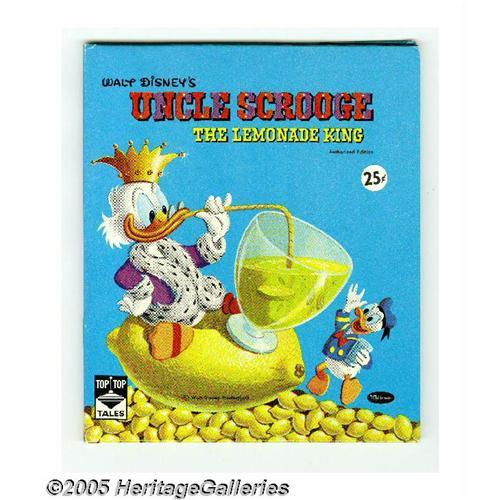 <B>Uncle Scrooge The Lemonade King #2465 File Copy (Whitman, 1960) Condition: VF+.</B></I> This is the Whitman Publishing File Copy of this 32-page ""Top Tales"" children's book. The art for the book was penciled by Carl Barks and adapted by Norman McGary. A certificate of authenticity attesting to the copy's provenance is included with this lot. Overstreet 2005 VF 8.0 value = $300; VF/NM 9.0 value = $470. <BR><BR><B>Important notice:</B> Heritage usually auctions material at the rate of 200-250 lots per hour. On some occasions eBay Live bid software or the Internet may not be able to keep up with the pace of the auction. We recommend placing a realistic absentee bid now as insurance to avoid disappointment. Occasionally the auctioneer may eliminate or reject an eBay Live bid, and the auctioneer may also reopen a lot after the close of the eBay live bidding (usually because we missed an audience bid), and may reject your bid even if it shows you as the winning bidder. By bidding via eBay Live, you agree that Heritage may award the lot to another bidder at its sole discretion under the circumstances described above or any other reasonable circumstances. Since eBay bids are not shown to us until we open the lot on the floor, we treat those bids just like floor bids. In most cases the floor responds before the eBay bid is presented to us, due to Internet lag time, so for consistency we have made it a policy that floor bids are always considered first over tie eBay live bids. Also please note that all Heritage lots purchased through eBay Live carry a 20% Buyer's Premium. Please make sure you read the Terms and Conditions before you bid. This lot is being auctioned in conjunction with a live floor auction by Heritage Galleries & Auctioneers. All final auction and invoice information will be supplied by Heritage Galleries & Auctioneers, and all other information should be considered preliminary. Lot:3492 <BR><BR><B>Winning Notification and Billing:</B> After the FINAL ses
