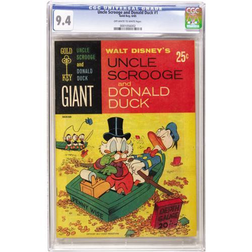 <B>Uncle Scrooge and Donald Duck #1 (Gold Key, 1965) CGC NM 9.4 Off-white to white pages.</B></I> One-shot. Paper cover. Overstreet 2006 NM- 9.2 value = $125. CGC census 9/06: 5 in 9.4, 3 higher.<BR><BR><b>Shipping:</b> Slabbed Comic (<a target="_blank" href="http://www.heritageauctions.com/common/shipping.php">view shipping information</a>)