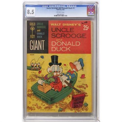 <B>Uncle Scrooge and Donald Duck #1 (Gold Key, 1965) CGC VF+ 8.5 Off-white pages.</B></I> Overstreet 2007 VF 8.0 value = $60; VF/NM 9.0 value = $93. CGC census 5/07: 3 in 8.5, 12 higher.<BR><BR><b>Shipping:</b> Comics - Slabbed (certified) (<a target="_blank" href="http://www.heritageauctions.com/common/shipping.php">view shipping information</a>)