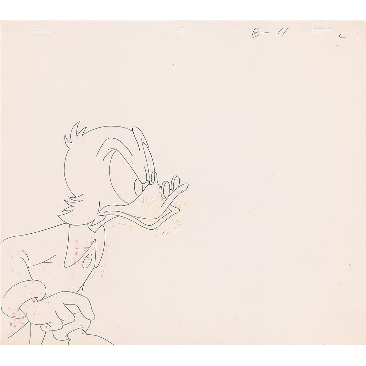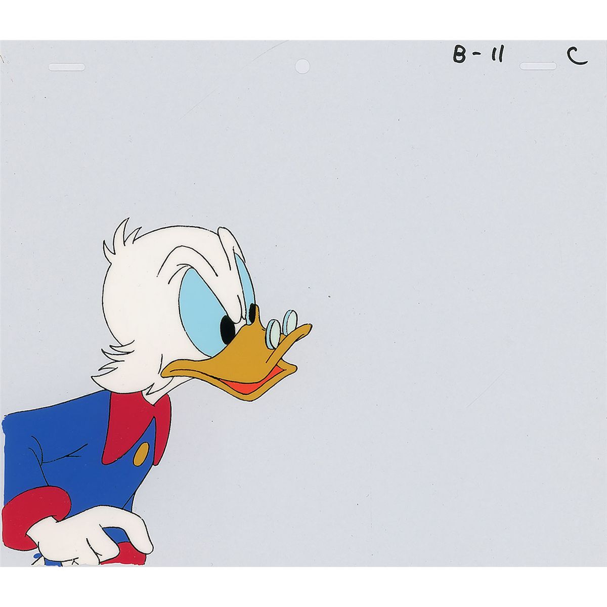 (Walt Disney Studios, 1987) Original production cel and matching drawing featuring Uncle Scrooge from Ducktales. Image measures 5 x 6, with overall cel dimensions of 10.5 x 9. The matched drawing is accomplished in graphite on untrimmed 10.5 x 9.5 animation paper. In fine condition.