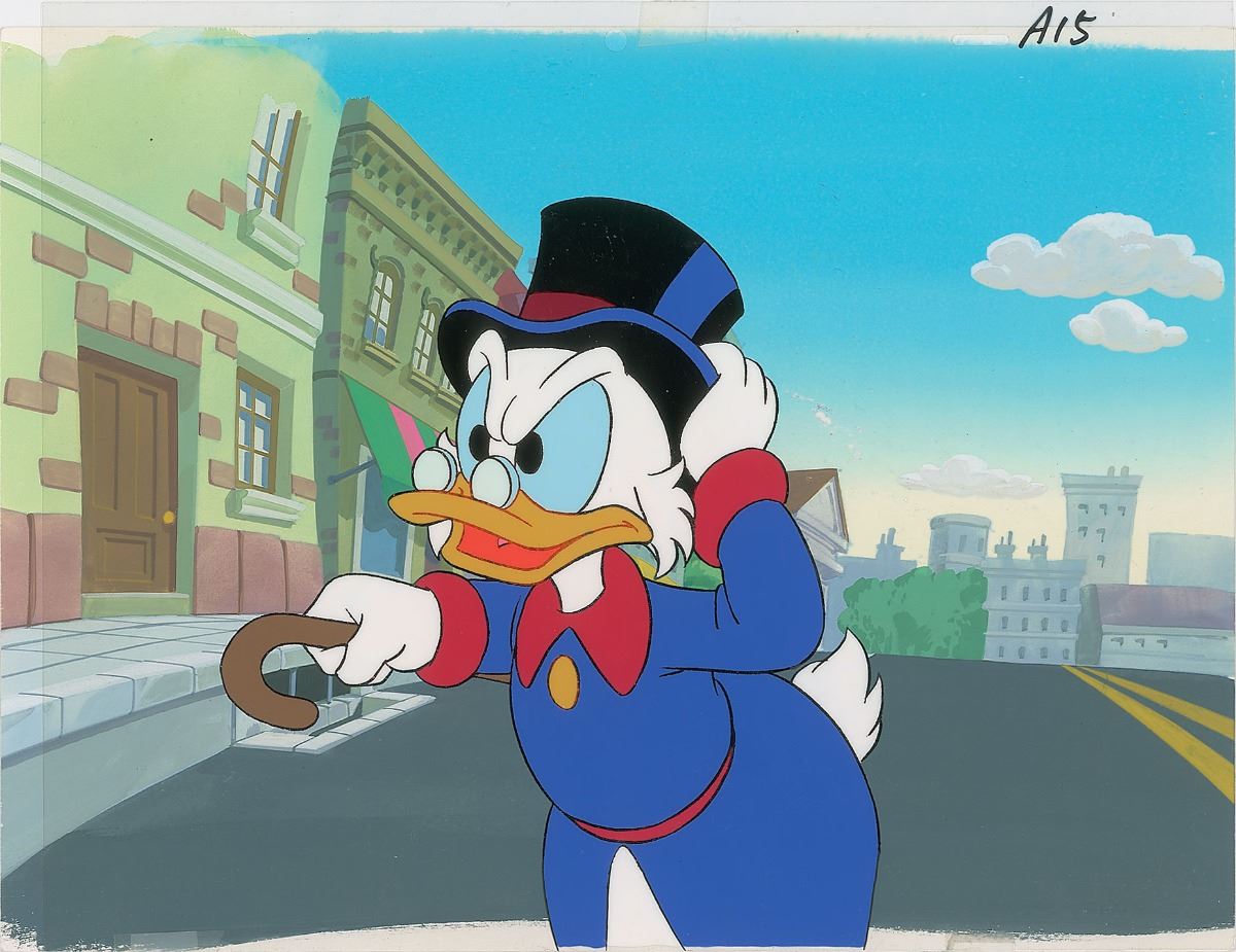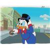 (Walt Disney Studios, 1987) Original production cel and production background featuring Uncle Scrooge from DuckTales, showing him angrily holding on to his top hat and pointing his cane. The cel is placed on a hand-painted production background. Image measures 7.25 x 8, with overall dimensions of 13.5 x 10.5. In fine condition.